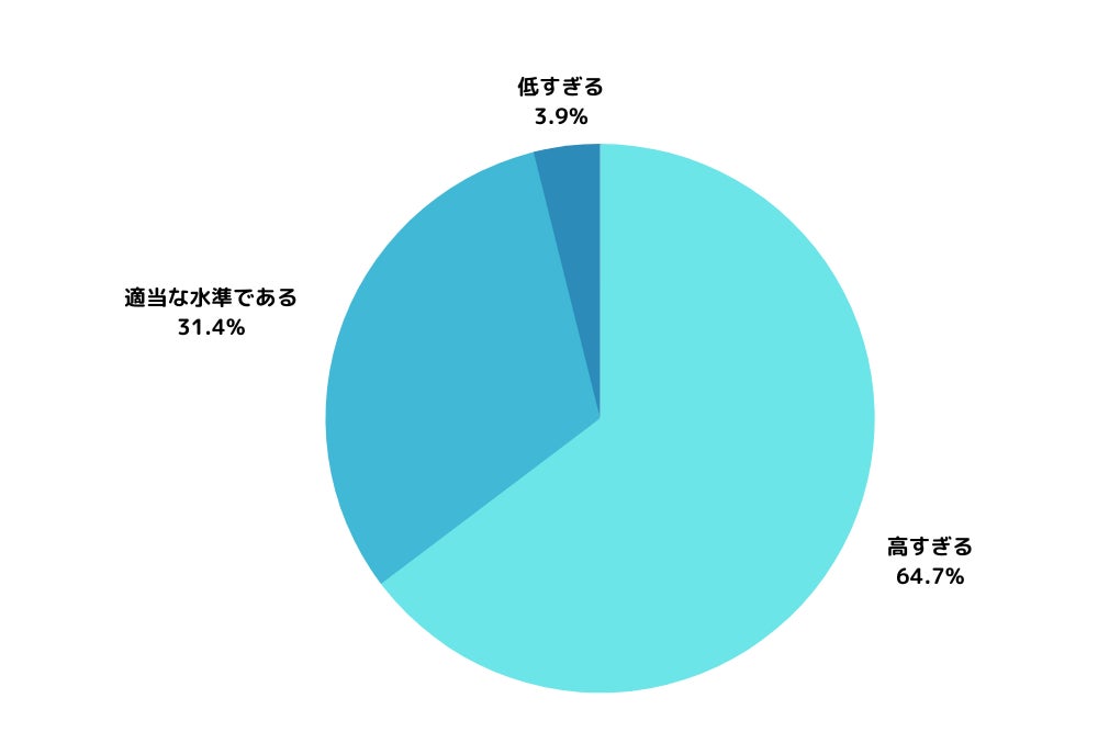 最も多かった回答は「高すぎる(64.7%)」、以降「適当な水準である(31.4%)」、「低すぎる(3.9%)」と続く結果になりました。