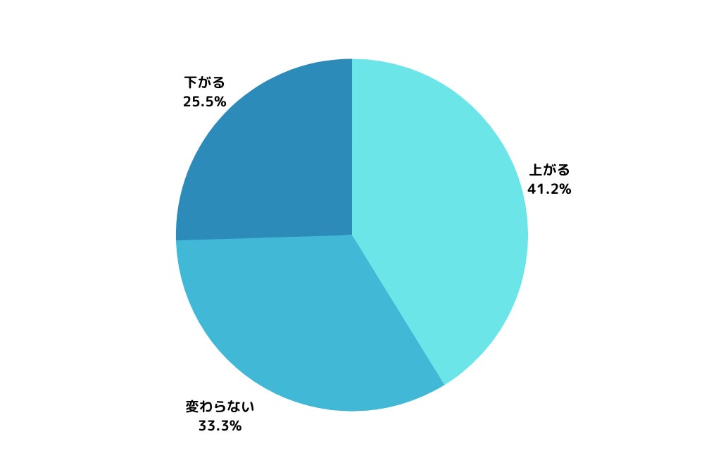 最も多かった回答は「上がる(41.2%)」、以降「変わらない(33.3%)」、「下がる(25.5%)」と続く結果になりました。