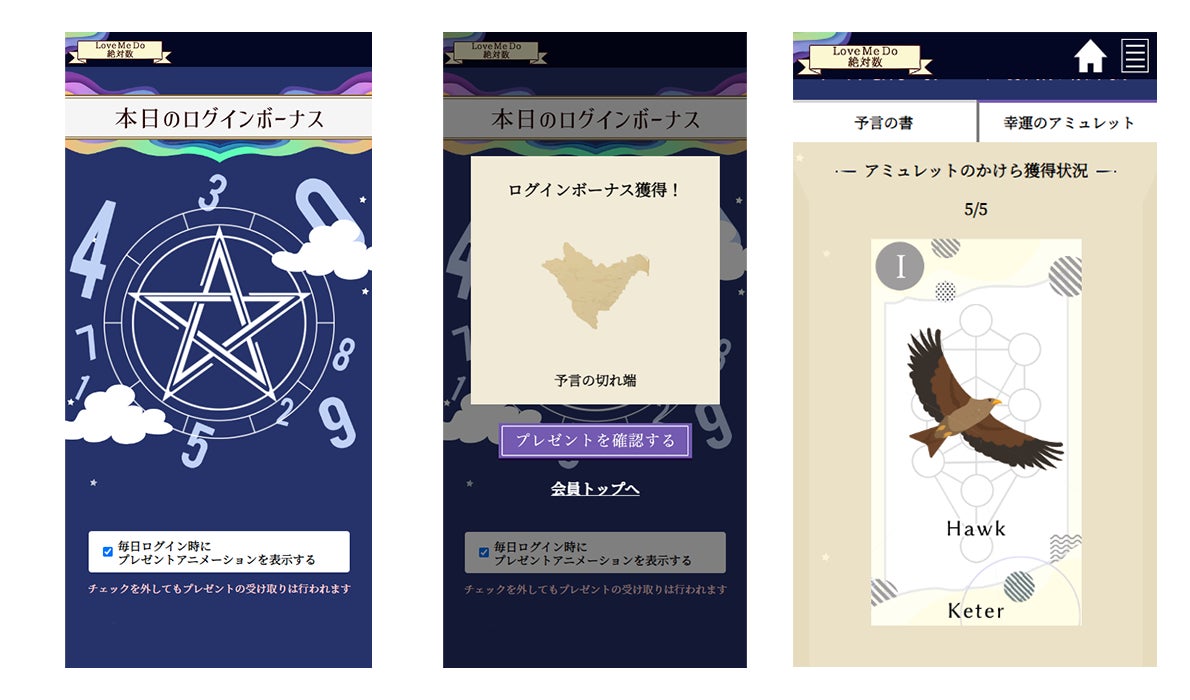 毎日ログインしていただくことで、お好きな占いの最初の項目を見る事の出来る「予言の書」と、ラブちゃんが特別な祈りを込めた「幸運のアミュレットカード」をプレゼントいたします。