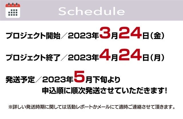 ※詳しい発送時期はに関しては活動レポートかメールにて適時ご連絡させて頂きます。