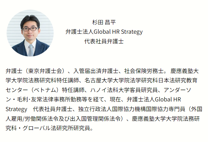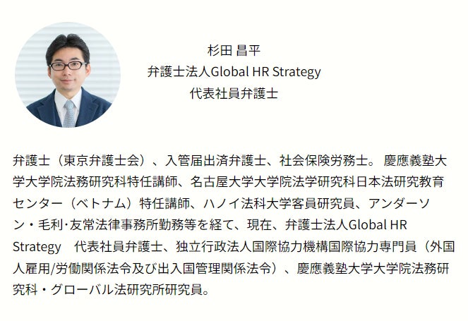 今回のセミナーは、弁護士法人Global HR Strategy・社会保険労務士法人外国人雇用総合研究所の杉田 代表弁護士・社会保険労務士をお招きして、新制度の重要なポイント、今後の影響などをわかりやすく解説します。