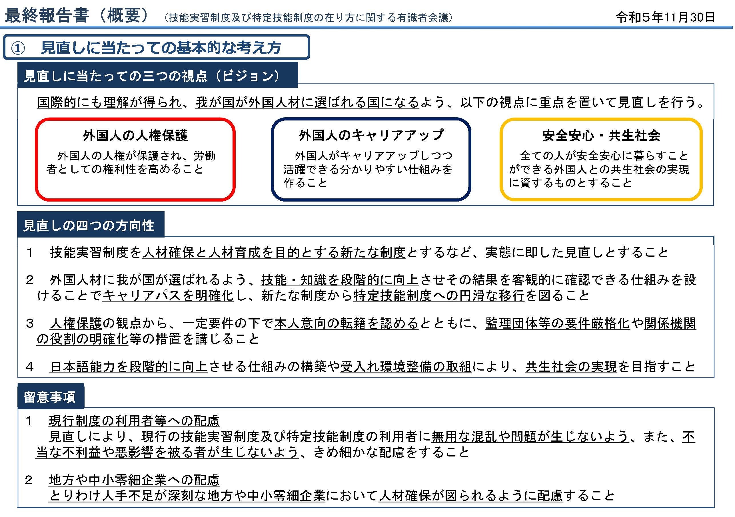 最終報告書では、国際的にも理解が得られ、我が国が外国人材に選ばれる国になるよう、①外国人材の人権保護、②外国人のキャリアアップ、③安全安心・共生社会の3つに重点をおいて、人材確保と人材育成を目的とする新たな制度を創設する、とされています。