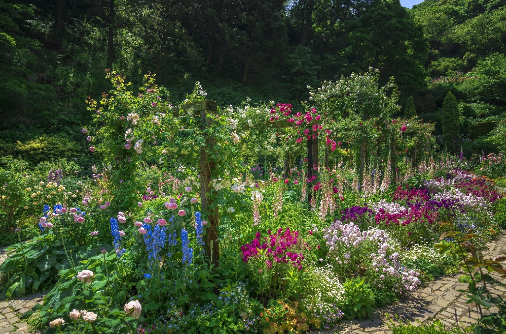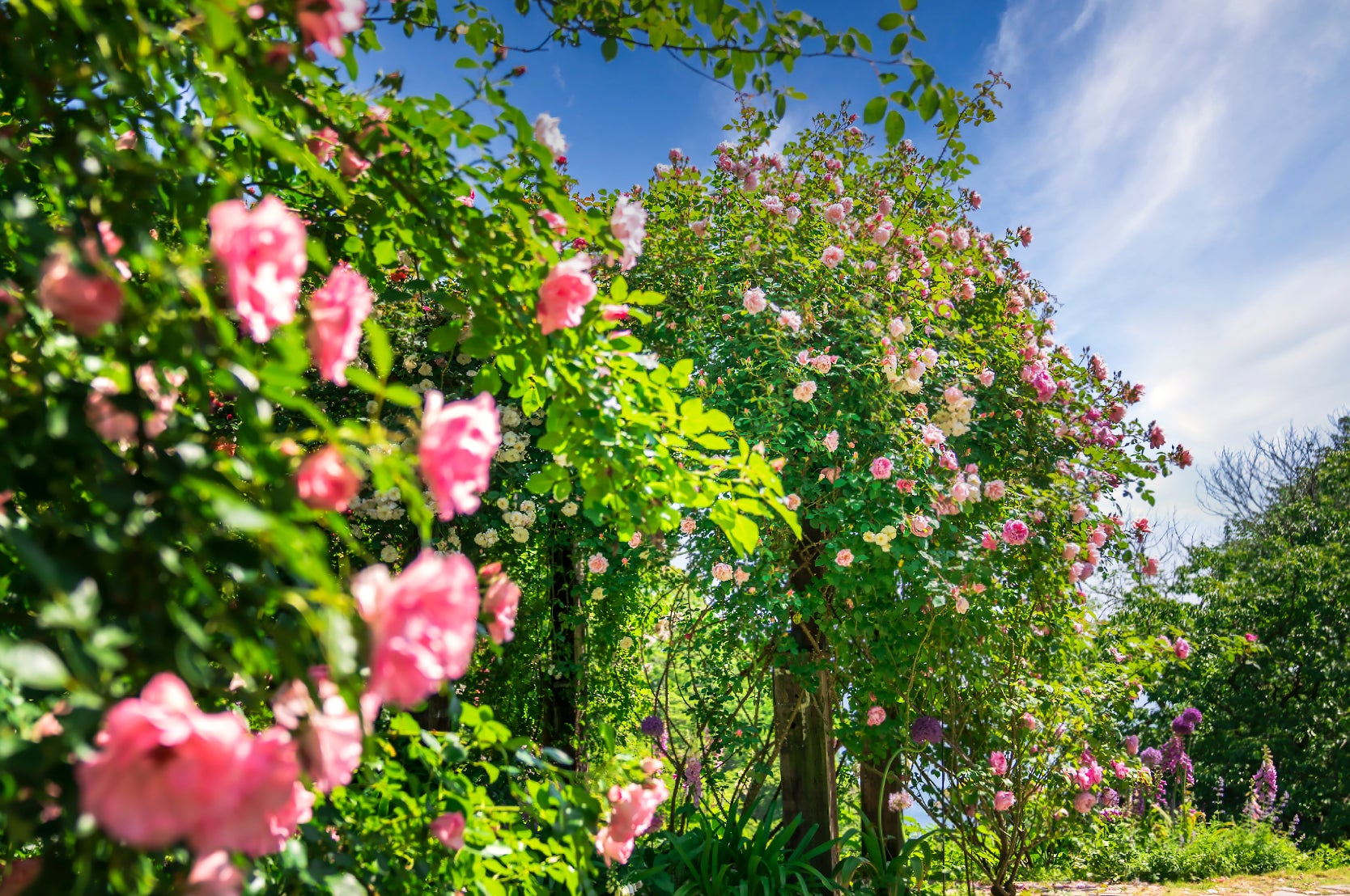 13のテーマガーデンの中に、バラをテーマとしたガーデンが9か所もあるLAND ART PARK「ACAO FOREST」。バラの野生種など他ではなかなか見られない品種や、イングリッシュローズとブルー系の草花との共演が見どころのイングリッシュローズガーデン。さらには鮮やかなピンクのバラ“アンジェラ″などが絡まるアーチに、足元には引き立て役の宿根草”オオバギボウシ″からなる花の回廊がロマンチックなエバーガーデンなど、バラが咲き誇るシーズンの園内は、さながらバラの花弁の中にいるような香りへと包まれます。