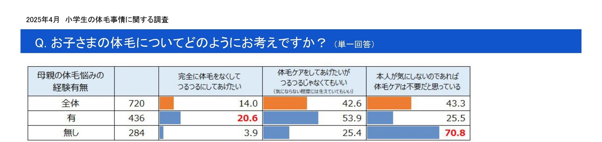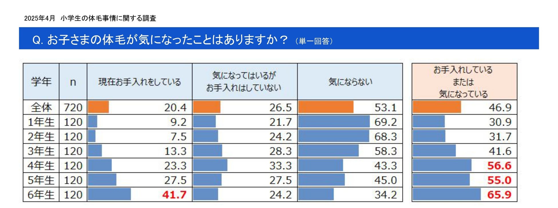小学生女児の母親720名へお子さまの体毛事情のアンケート調査 高学年の半数以上、体毛が気になる