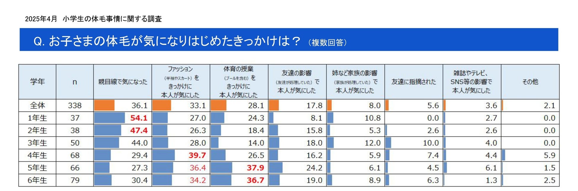 お子さまの体毛が気になり始めたきっかけを複数回答で聞いた質問では、「親目線で気になった」が全体を通して36.1%と最も多く、中でも低学年では約半数の結果でした。4年生では「ファッション(半袖やスカート)をきっかけに本人が気にした」が39.7%と最多で、5・6年生では「体育の授業(プールを含む)をきっかけに本人が気にした」が最多となりました。高学年になると本人の意向をきっかけにケアをはじめているようです。