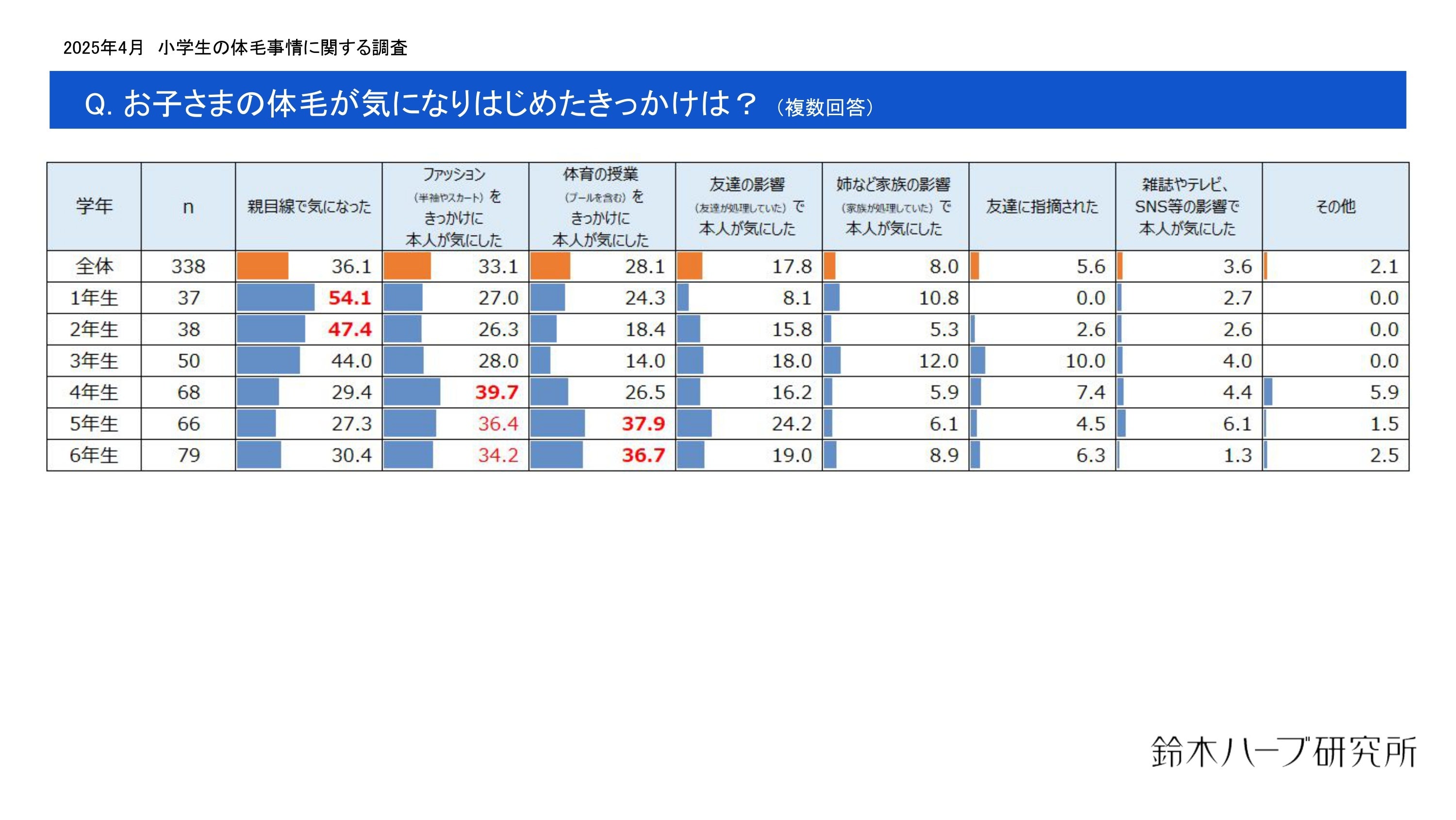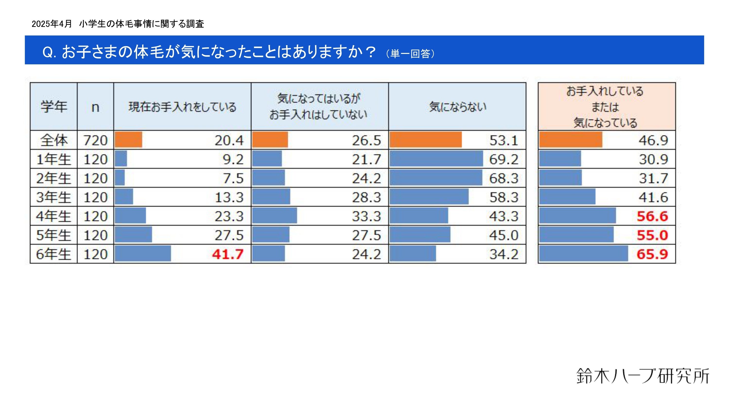 株式会社鈴木ハーブ研究所は、25~49歳の女性で小学1年生から6年生までの女児の母親を対象に、「お子さまの体毛事情に関する調査」を実施しました。調査結果の一部を抜粋して発表します。