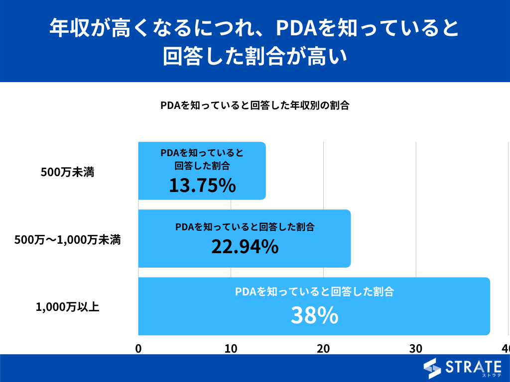 PDAを知っていると回答した割合を年収別でみてみますと、1,000万以上が最も多く38%、次いで500万~1,000万未満の22.94%、500万未満は13.75%にとどまりました。