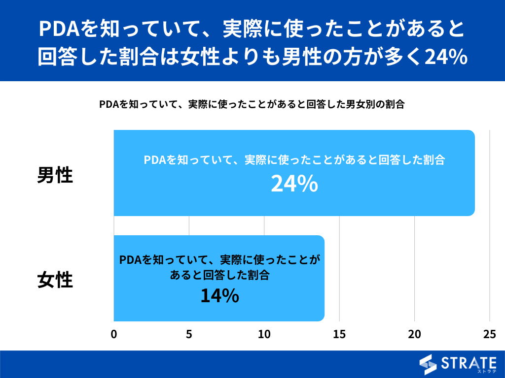 【PDAを知っていて、実際に使ったことがあると回答した割合は女性よりも男性の方が多く24%】