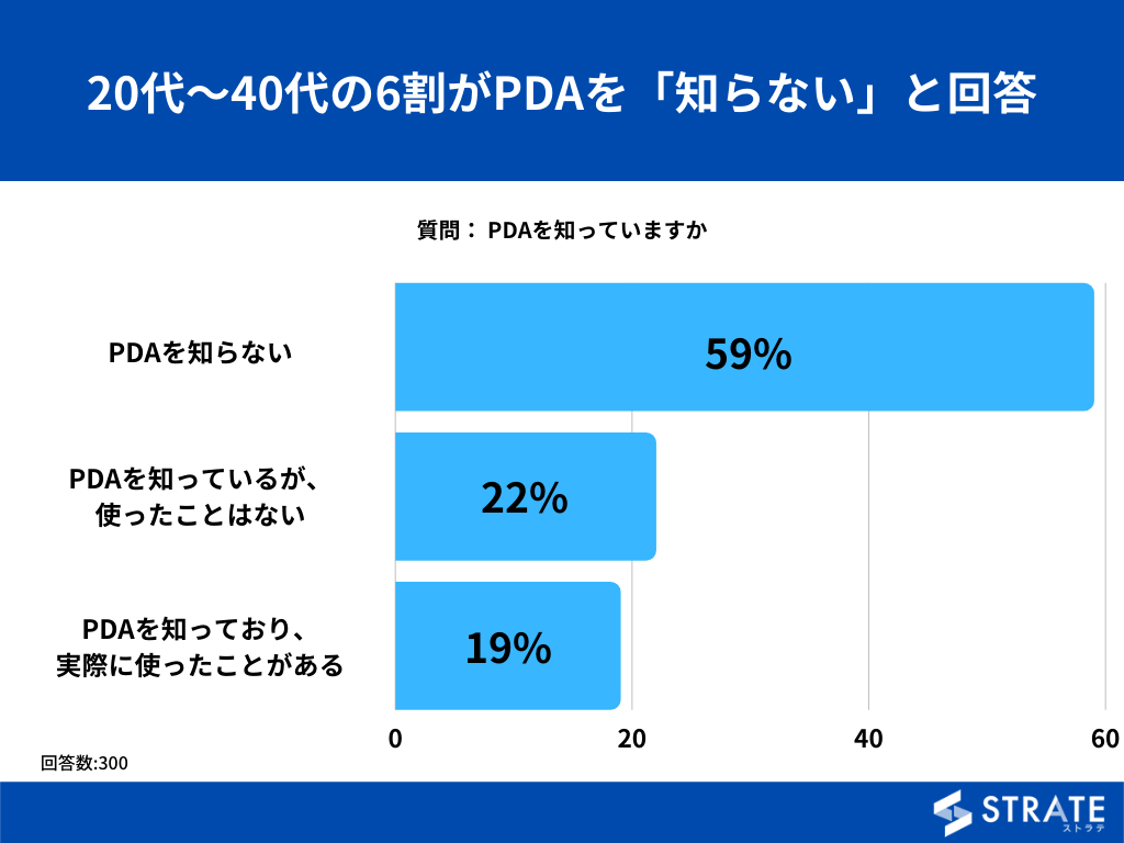20代〜40代の男女を対象とした「PDAを知っていますか?」というアンケートで最も多かった回答は「PDAを知らない」で59%でした。