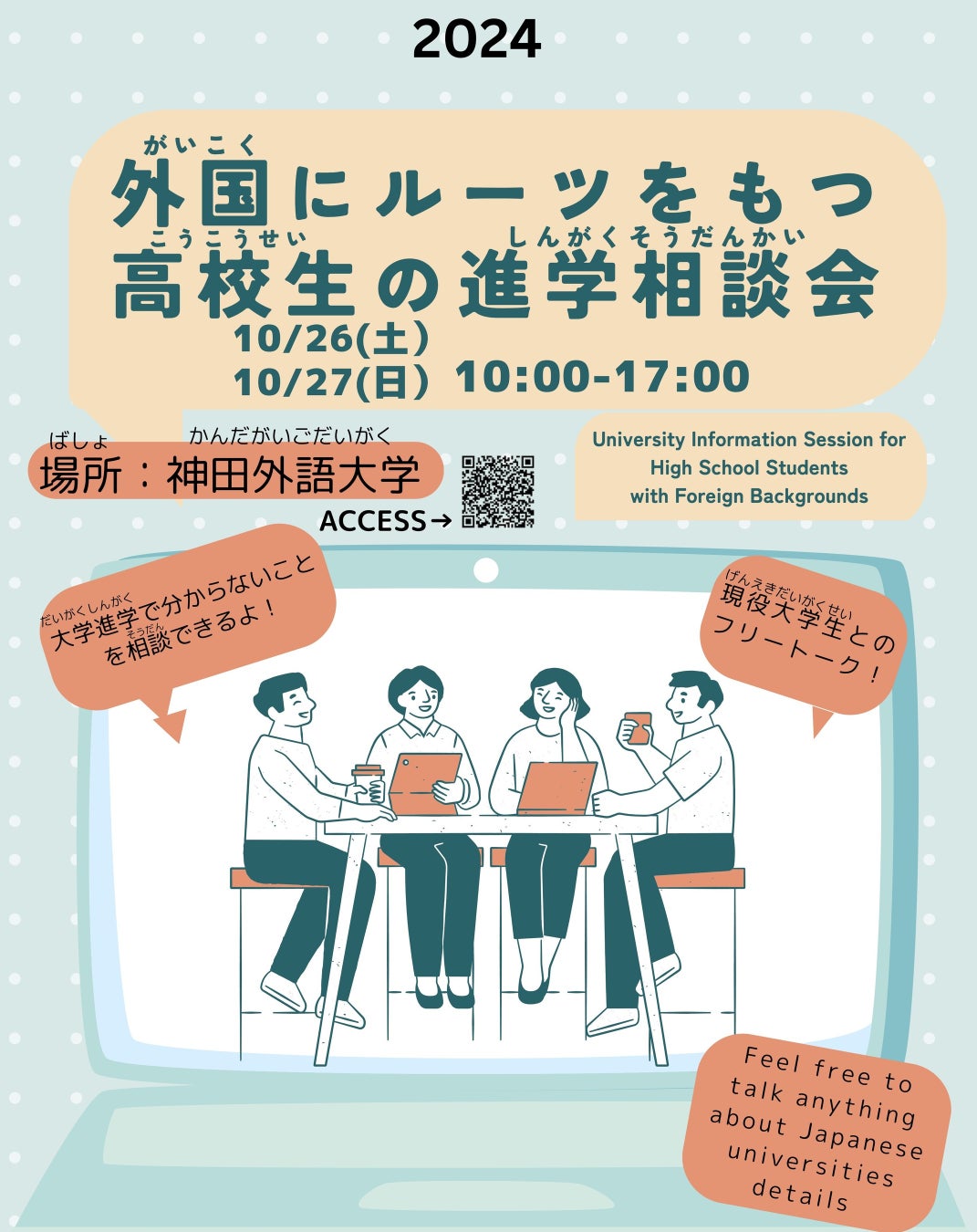 学生団体「SaladBowl√1」が、外国にルーツをもつ高校生向けの進学相談会を開催します。日本語に不安がある方でも本学の学生とのフリートークを通じて、入試制度や学費、大学の選び方など、日本の大学進学に関する疑問や不安をご相談いただけます。