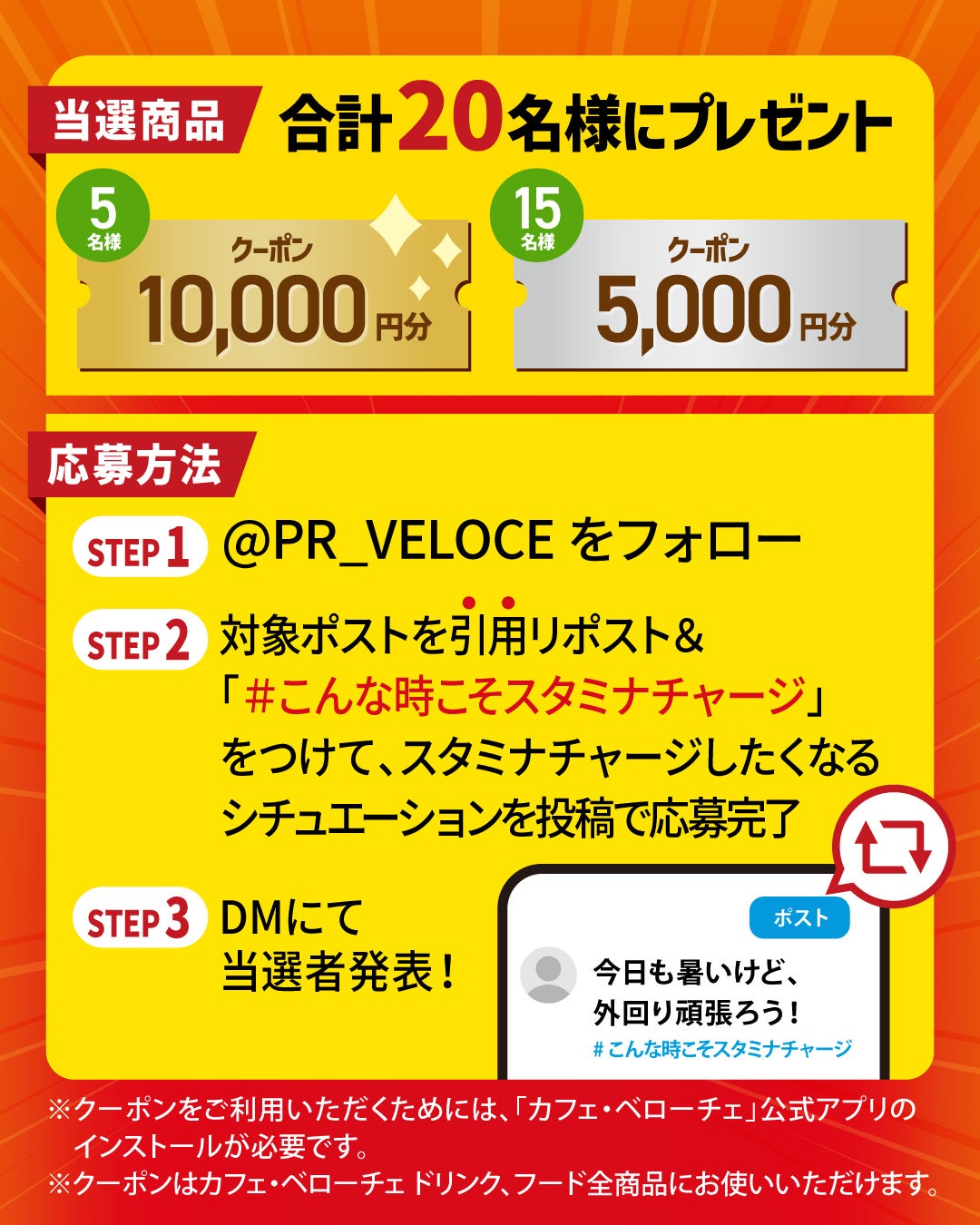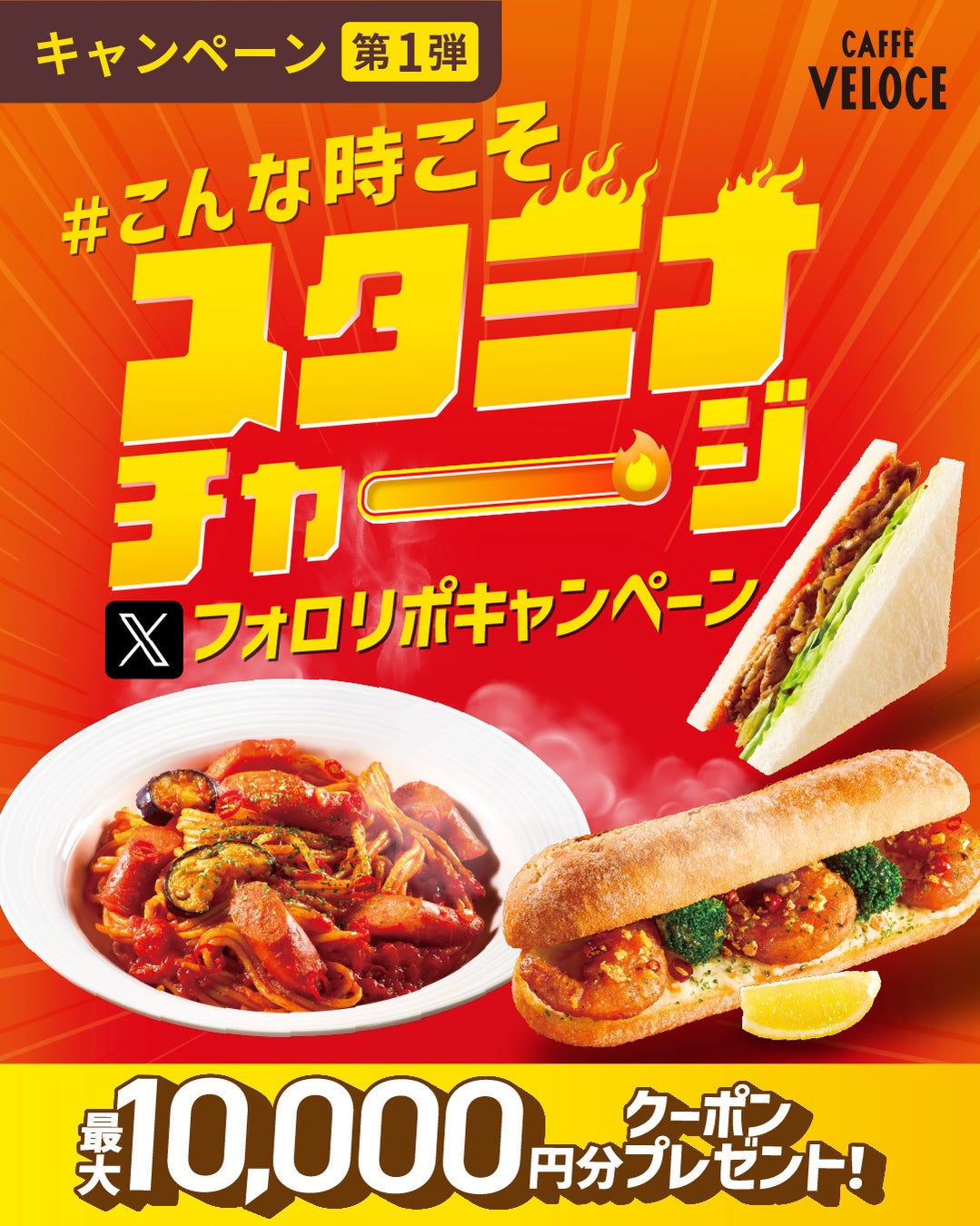 多くのお客様に『カフェ・ベローチェ』にてスタミナチャージをしていただきたく、キャンペーン第1弾として6月11日(水)より、カフェ・ベローチェの公式Xアカウント(@PR_VELOCE)をフォローし、対象ポストの引用リポストと、指定のハッシュタグをつけて、スタミナチャージしたくなるシチュエーションを投稿していただくと『カフェ・ベローチェ』で利用できる最大1万円分のクーポンが抽選で当たるSNSキャンペーンを実施。さらに第2弾として7月にもお得なキャンペーンを実施予定です。