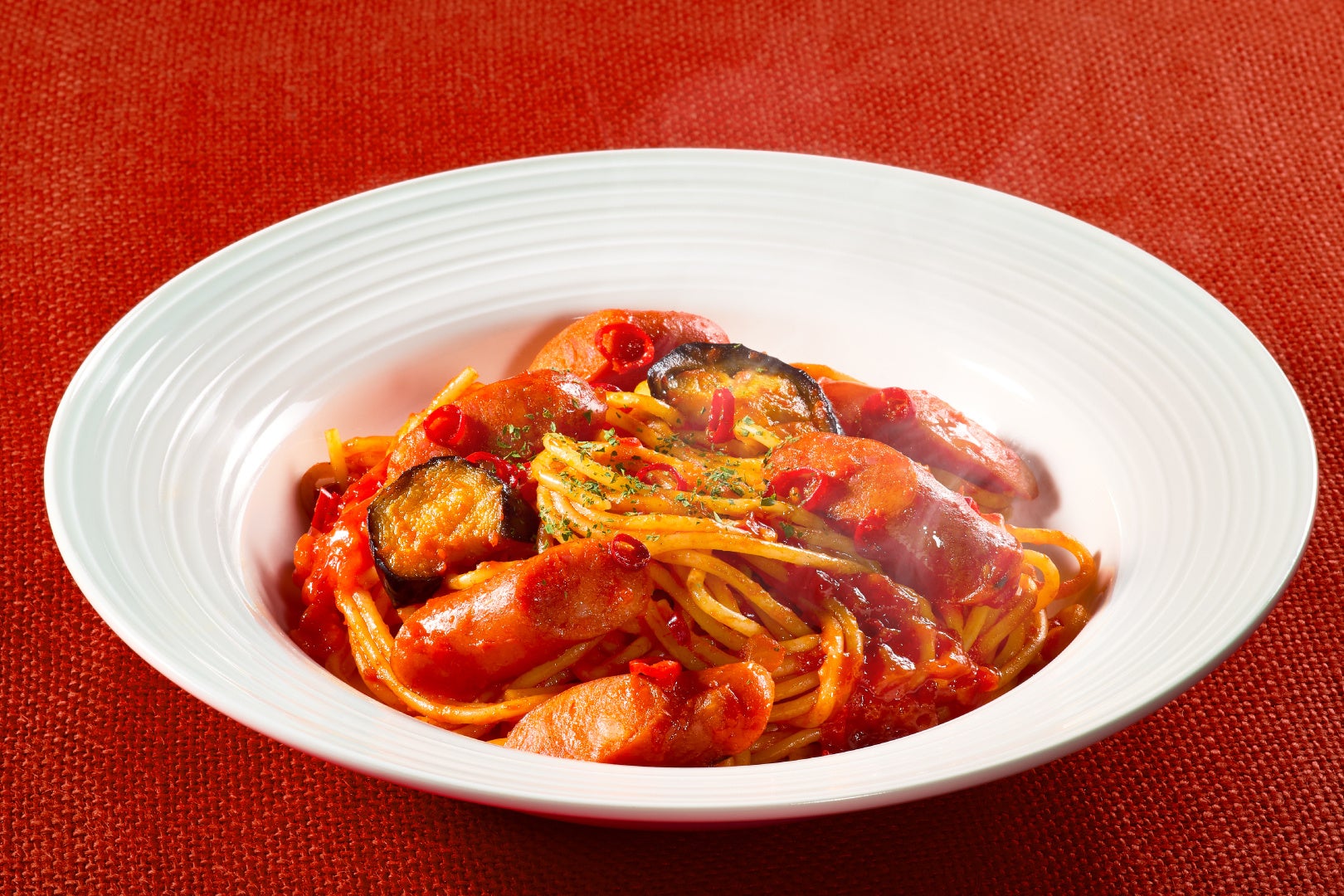 唐辛子の辛みと、にんにくの旨味が際立つオリジナルのトマトソースに、夏野菜の揚げナスや、ピリ辛チョリソーを盛り付けた“旨辛”アラビアータです。トマトソースには隠し味としてチーズを加えることで味わいにコクをプラス。後引く辛さがクセになる、たっぷりのトマトソースをしっかり麺と絡めてお召しください。