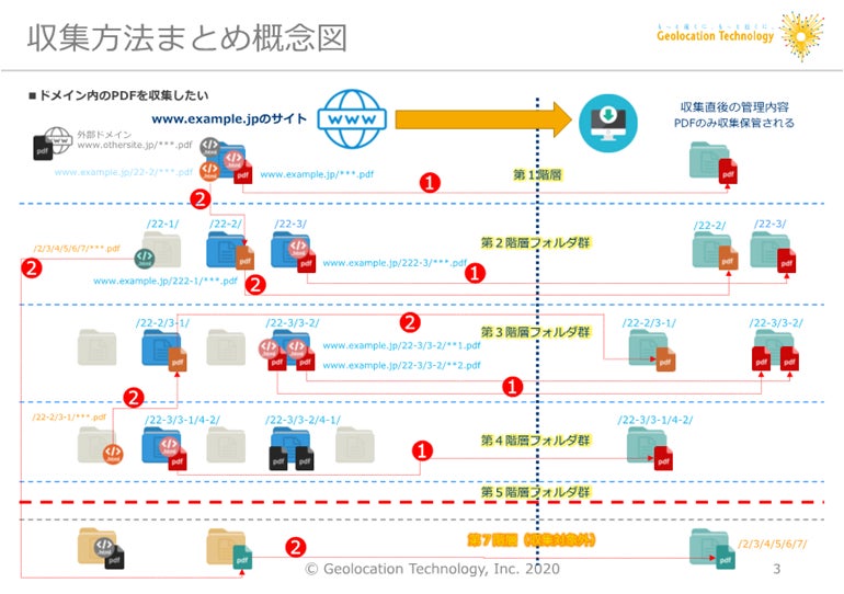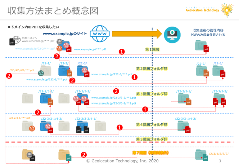 ※5階層内のHTMLにPDFへのリンク(<a href=”*.pdf”></a>)があれば,収集範囲の対象階層外であっても収集する。一方、外部ドメインへのリンクは収集しない。