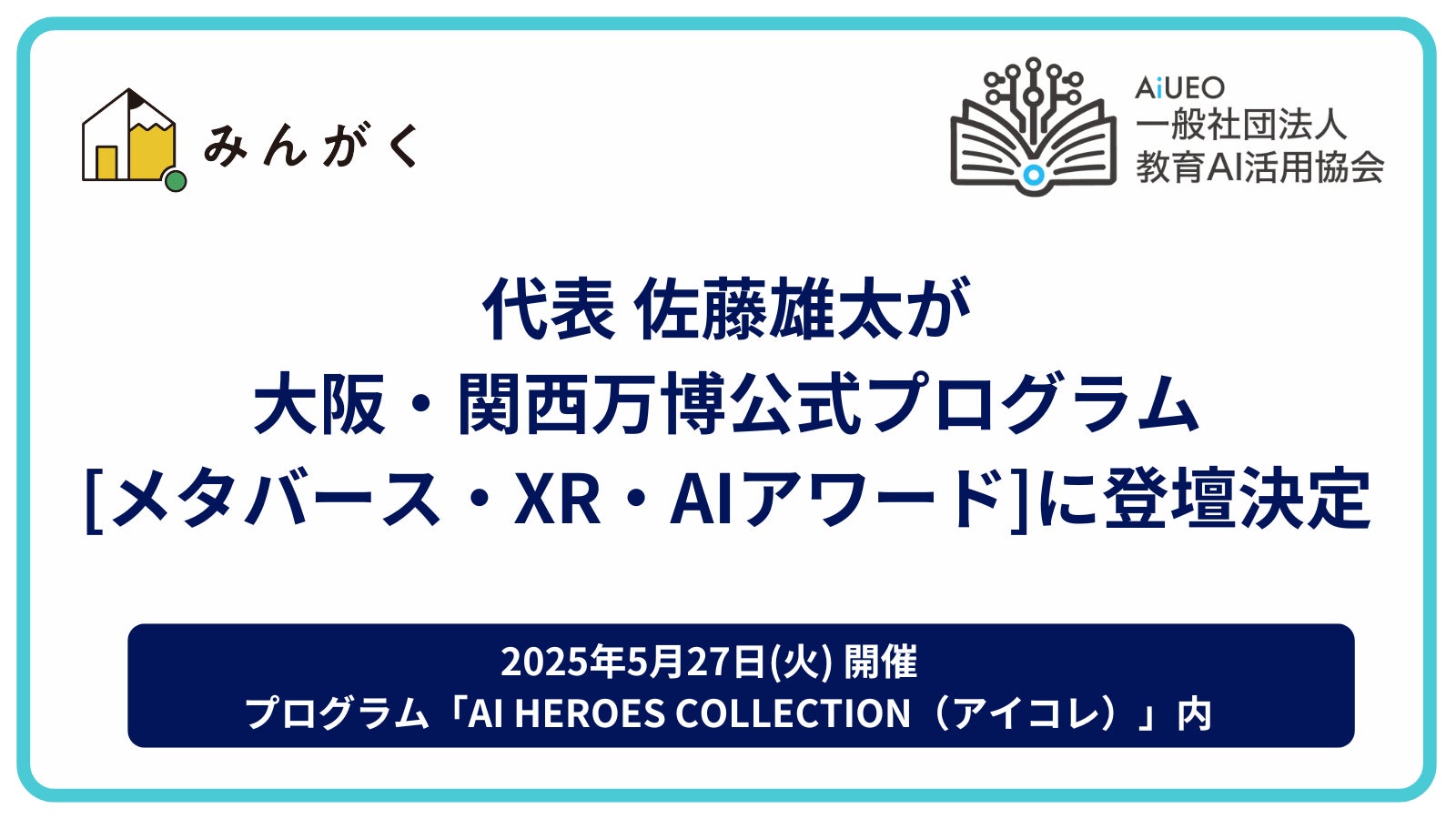 株式会社みんがく(本社:東京都新宿区、代表取締役:佐藤雄太、以下「当社」)は、当社代表の佐藤が、一般社団法人 教育AI活用協会(本社:東京都港区、代表理事を兼任)の代表理事として、2025年5月27日(火)に開催されるEXPO2025大阪・関西万博の公式プログラム「メタバース・XR・AIアワード」に登壇することをお知らせします。