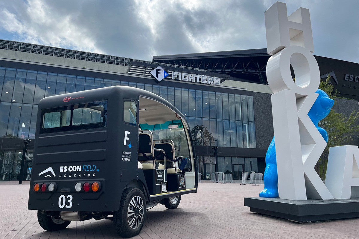 北海道ボールパークFビレッジでは、戦略的パートナーシップ契約を締結しているビーワイディージャパン株式会社が提供するEVカートの運行を開始いたします。EVカートに乗りながら、Fビレッジを約10分かけてのんびりと回ることができます。ご家族・ご友人と、ぜひご乗車ください!