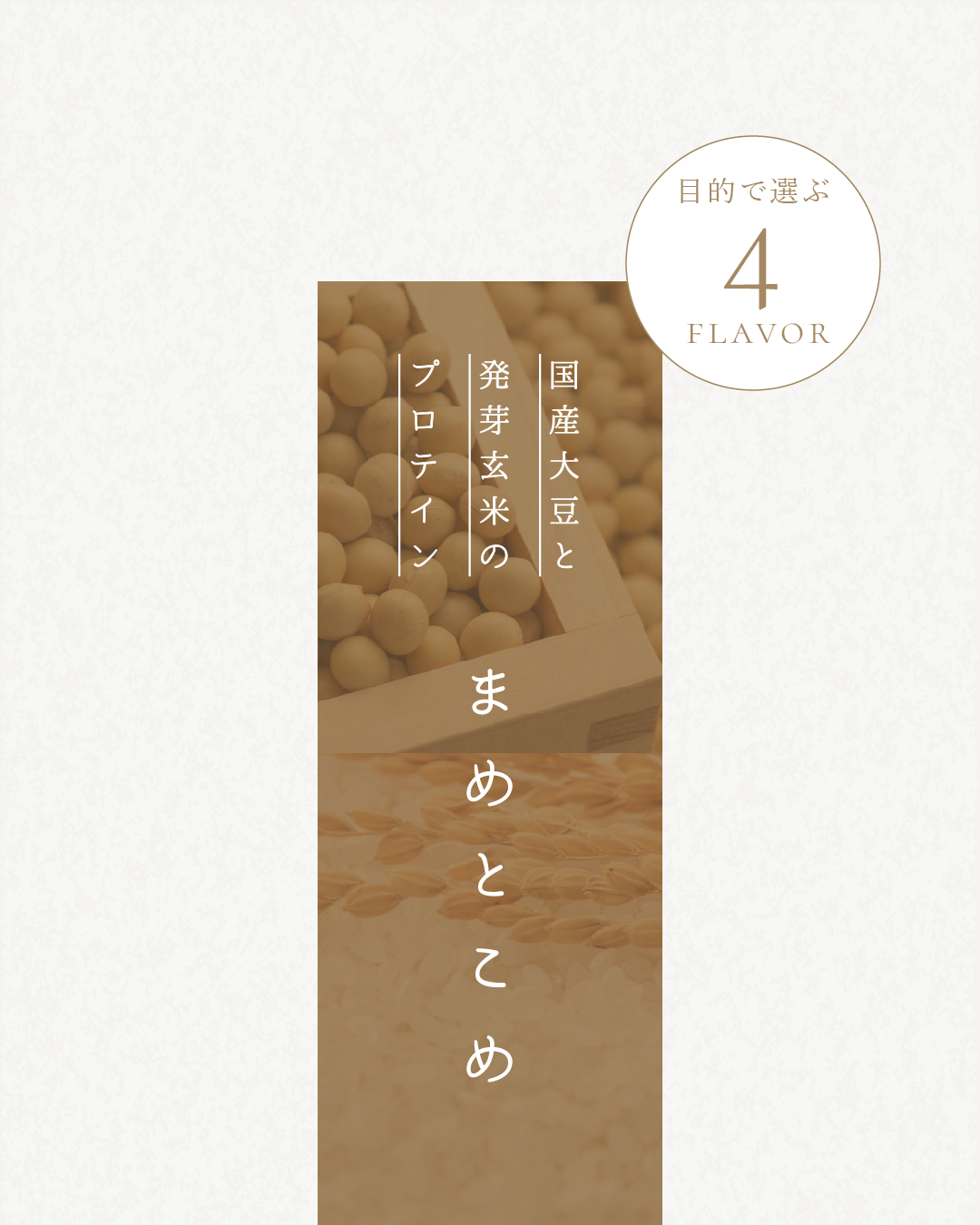 日本人に古くからなじみのある “豆"と"米” をベースに、国産大豆・発芽玄米・和漢植物を組み合わせ、毎日の体調リズムに寄り添う4タイプをラインナップしました。もちろん人工甘味料・香料・保存料は一切不使用です。