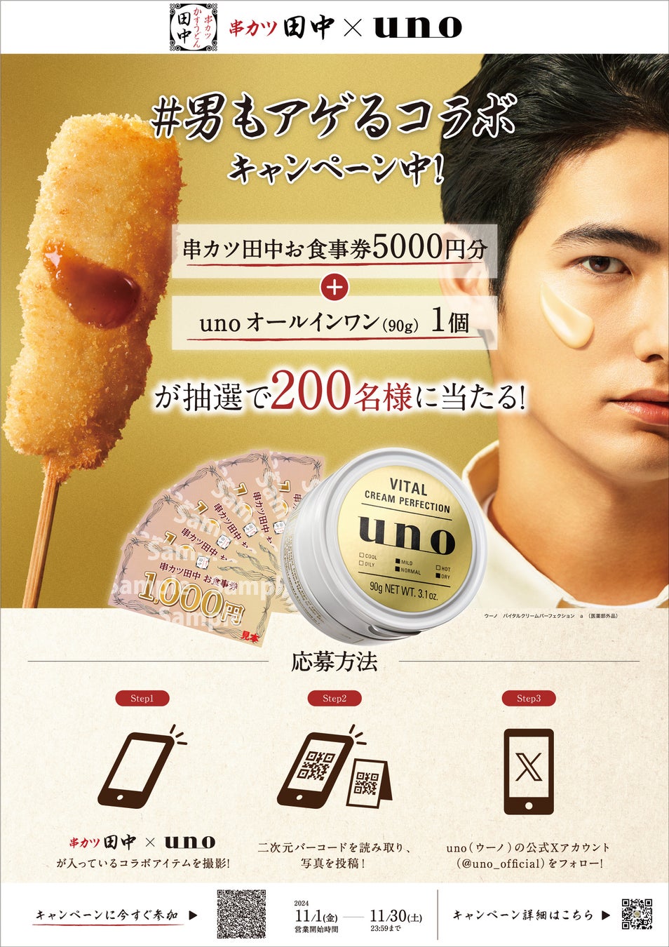 株式会社ファイントゥデイ(本社:東京都港区、代表取締役 社長 兼 CEO小森哲郎)が展開する、ブランド誕生以来メンズビューティーケアを通して男性の新たな魅力を引き出すサポートをしてきた「uno(ウーノ)」は、このたび株式会社串カツ田中ホールディングス(本社:東京都品川区東五反田、代表取締役社長:坂本 壽男)とのコラボレーション企画「男もアゲるコラボ」を2024年11月1日(金)より開始いたします。「串カツ田中」の全国334店舗で展開するコラボでは、店内に設置されたコラボアイテムを見つけて投稿することで、unoの商品や串カツ田中の食事券が抽選で当たるキャンペーン、「男もアゲるウーノ5本盛り」コラボメニューや、串カツ田中名物「チンチロリンドリンク」の注文で、サイコロの出た目によってunoの商品がもらえるなど、2024年11月1日(金)~2024年11月30日(土)のコラボ期間中、様々な仕掛けをご用意して、ご来店をお待ちしています。