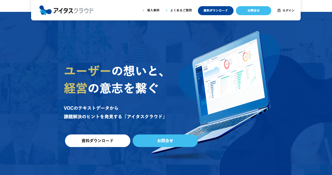 「アイタスクラウド」は最先端の自然言語処理技術を用いた文章解析AI「アイタス」をエンジンとする顧客の声(VoC:Voice of Customer)データ解析ダッシュボードであり、顧客の声を可視化するだけでなく、独自のフレームワークにより優先課題を明らかにすることで課題解決のヒントを見つけ、打ち手に繋げることができる業務支援ツールです。