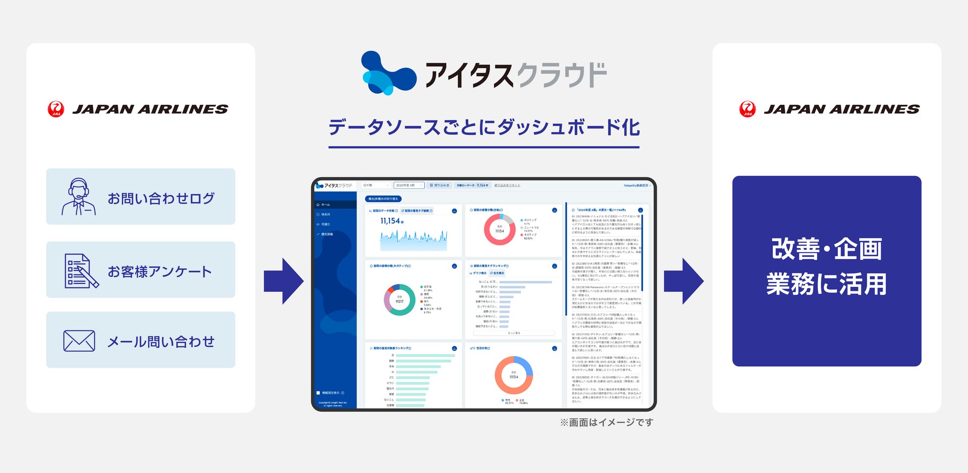 日本航空に寄せられる顧客の声(VoC:Voice of Customer)のテキストデータとして、お問い合わせログやお客様アンケート、メールでのお問い合わせなどを対象とし、アイタスクラウドでデータソースごとに解析・可視化します。この結果からお客様目線での課題・期待を炙り出し、業務改善や業務企画の精度・解像度を高め、日々の業務に活用頂きます。