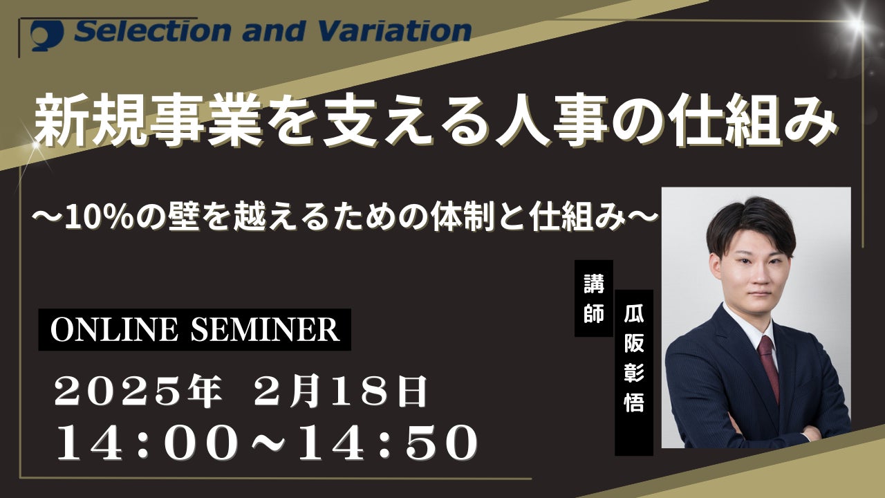組織・人事コンサルティングファームであるセレクションアンドバリエーション株式会社(以下、当社、東京都千代田区丸の内、大阪市西区、名古屋市西区 / 代表取締役社長:平康慶浩/ URL:https://sele-vari.co.jp/ )は「新規事業を支える人事の仕組み~10%の壁を越えるための体制と仕組み~」セミナーを2025年2月18日(火)14:00〜14:50に開催することをお知らせいたします。