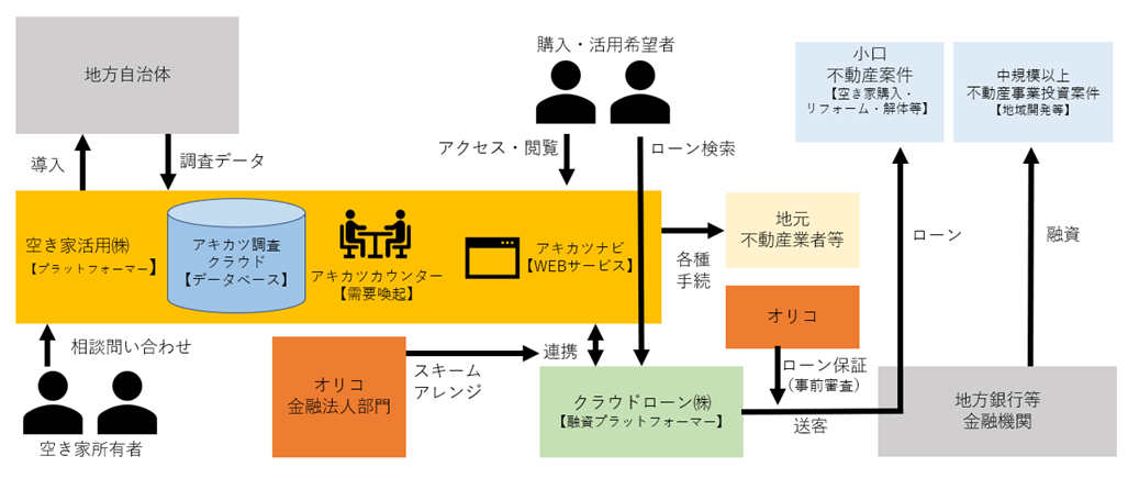 そこで、自治体と連携した空き家データを保有し、空き家所有者向けの空き家利活用の伴走サービス「アキカツカウンター」等を提供する空き家活用株式会社と、地域金融機関とのネットワークを保有して多様な金融商品・サービスを展開するオリコが、空き家購入意向者の状況や金融商品のあり方とマーケットについて検討を重ね、『アキカツローン』を商品化した上で、枠組みの始動に至りました。