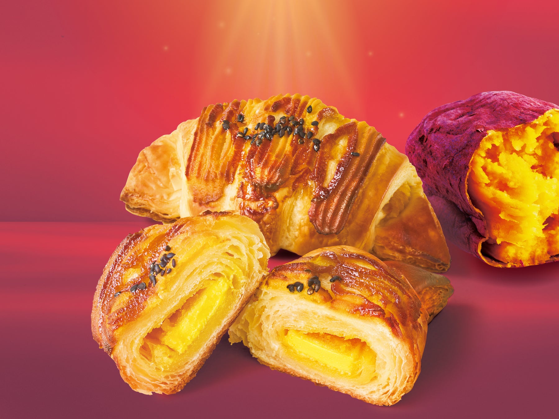 「プレミアムチョコクロ スイートポテト」は、「ねっとりとした食感と蜜が溢れるような甘さ」が特長の鹿児島県産安納芋を贅沢に使用した、まさに“おいもづくし”を極めた一品。サクサクのクロワッサン生地の中には、安納芋チョコレートと、とろけるような安納芋クリームをたっぷりと包み込みました。さらに、表面にはスイートポテトを思わせる波模様に絞った安納芋クリームをトッピングし、見た目にも華やかさをプラスしました。焼き上げることで香ばしさが増すビターカラメルソースと黒ゴマが絶妙なアクセントとなり、中のしっとりとした甘さとの対比が、食べるたびに新たな発見を与えてくれます。