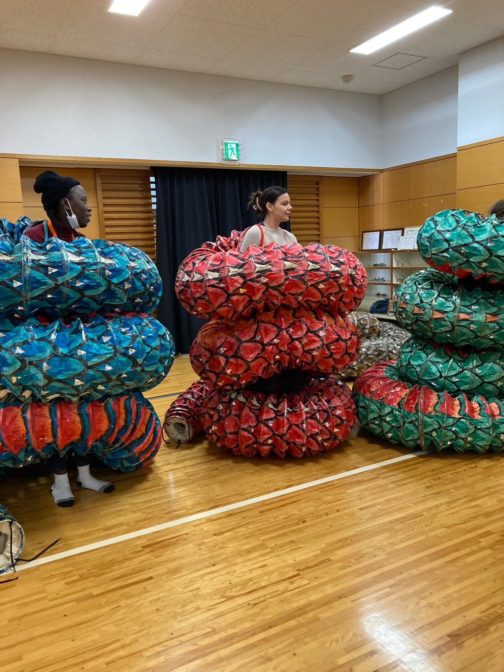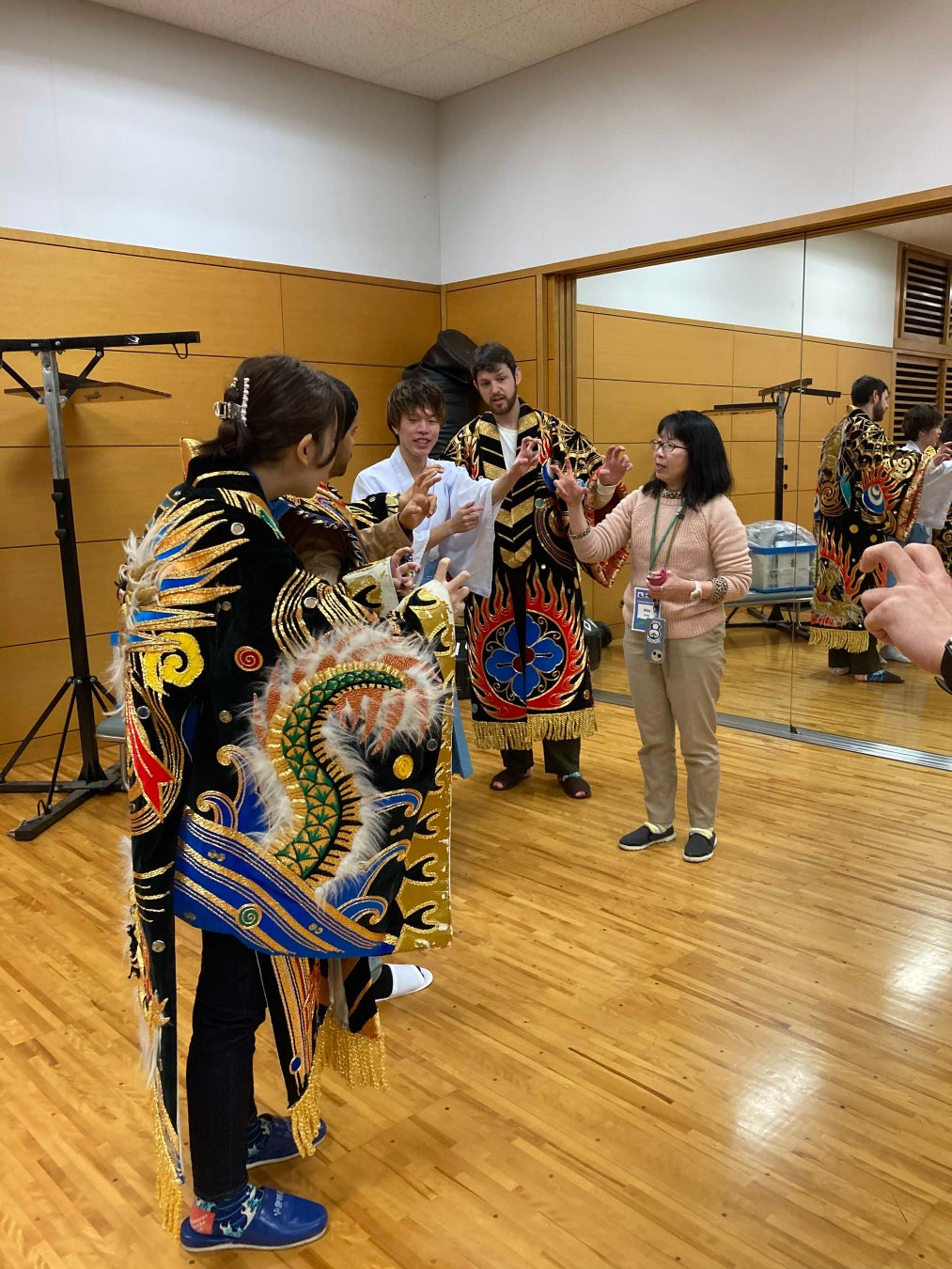その後、グループで15分ごとに、大蛇の蛇胴、塵輪の衣裳、奏楽、所作の手ほどきを受け、石見神楽の体験をしました。