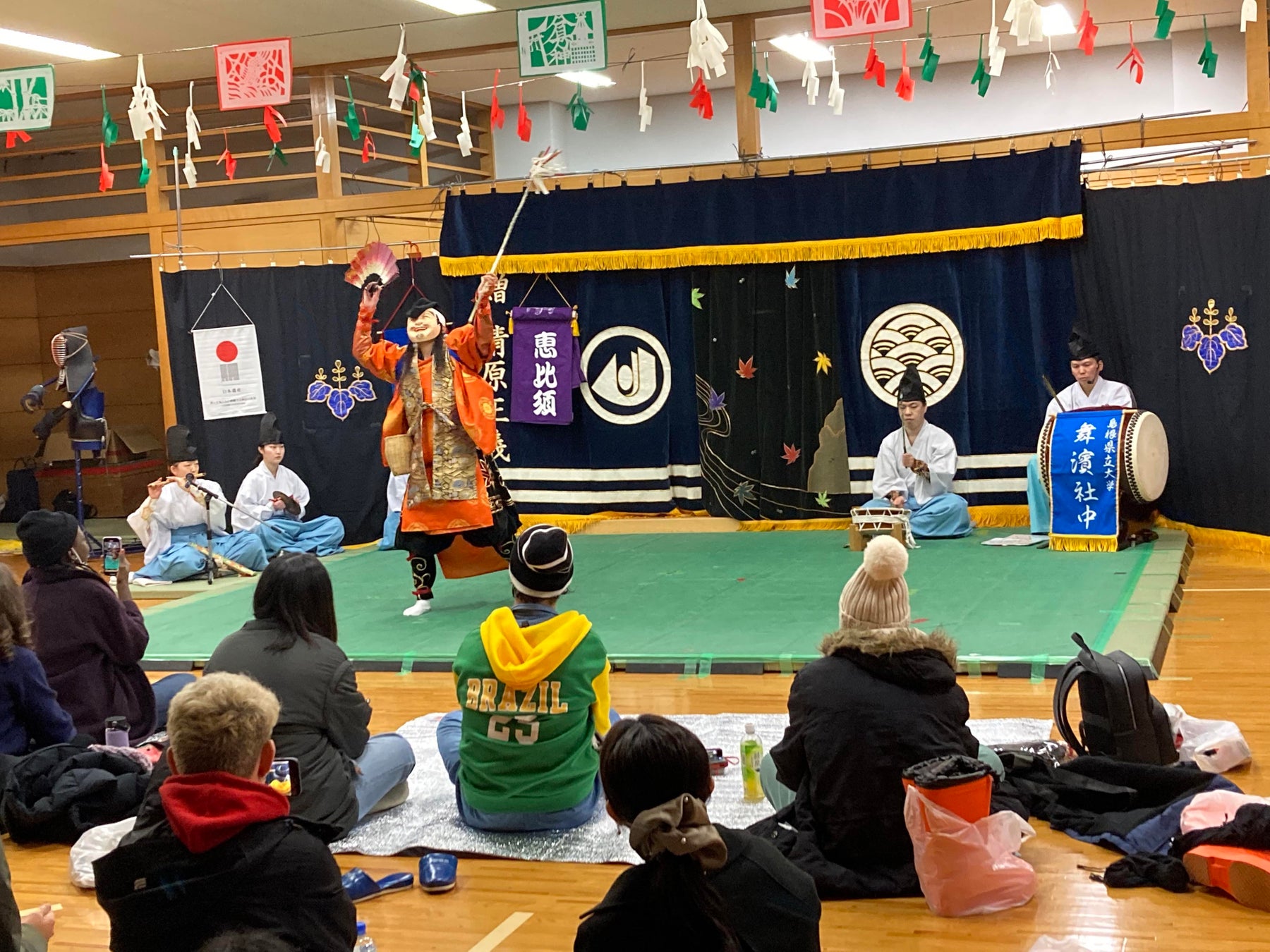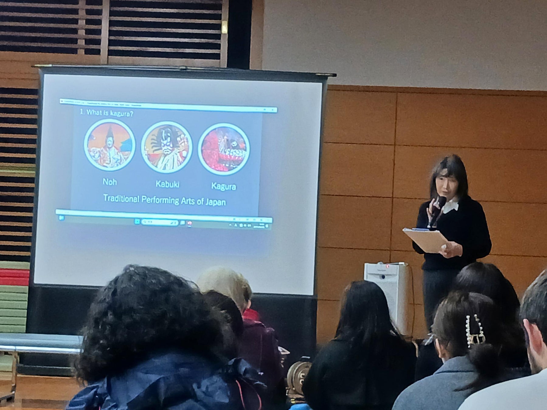 午前中は地域政策学部の西嶋一泰講師の島根県における人口減少の課題と全国の神楽についての講義、国際関係学部の江口真理子教授の石見神楽が継承された要因についての講義を聞いたのち、島根県立大学の学生による石見神楽サークル「舞濱社中」による演舞を鑑賞しました。
