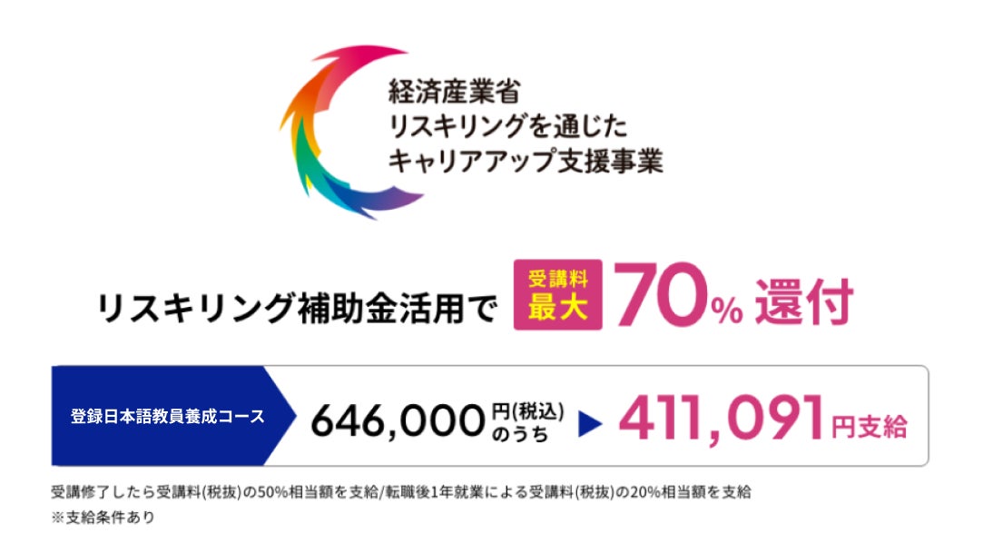 TCJ日本語教師養成講座は経済産業省による「リスキリングを通じたキャリアアップ支援事業」の対象講座となりました。本制度をご利用いただくと、無料でキャリア相談が受けられることに加えて、最大でTCJ日本語教師養成講座の受講料の70%の補助が受けられます。70%の補助を受けた場合の実質負担額は¥234,909円(税込)です。