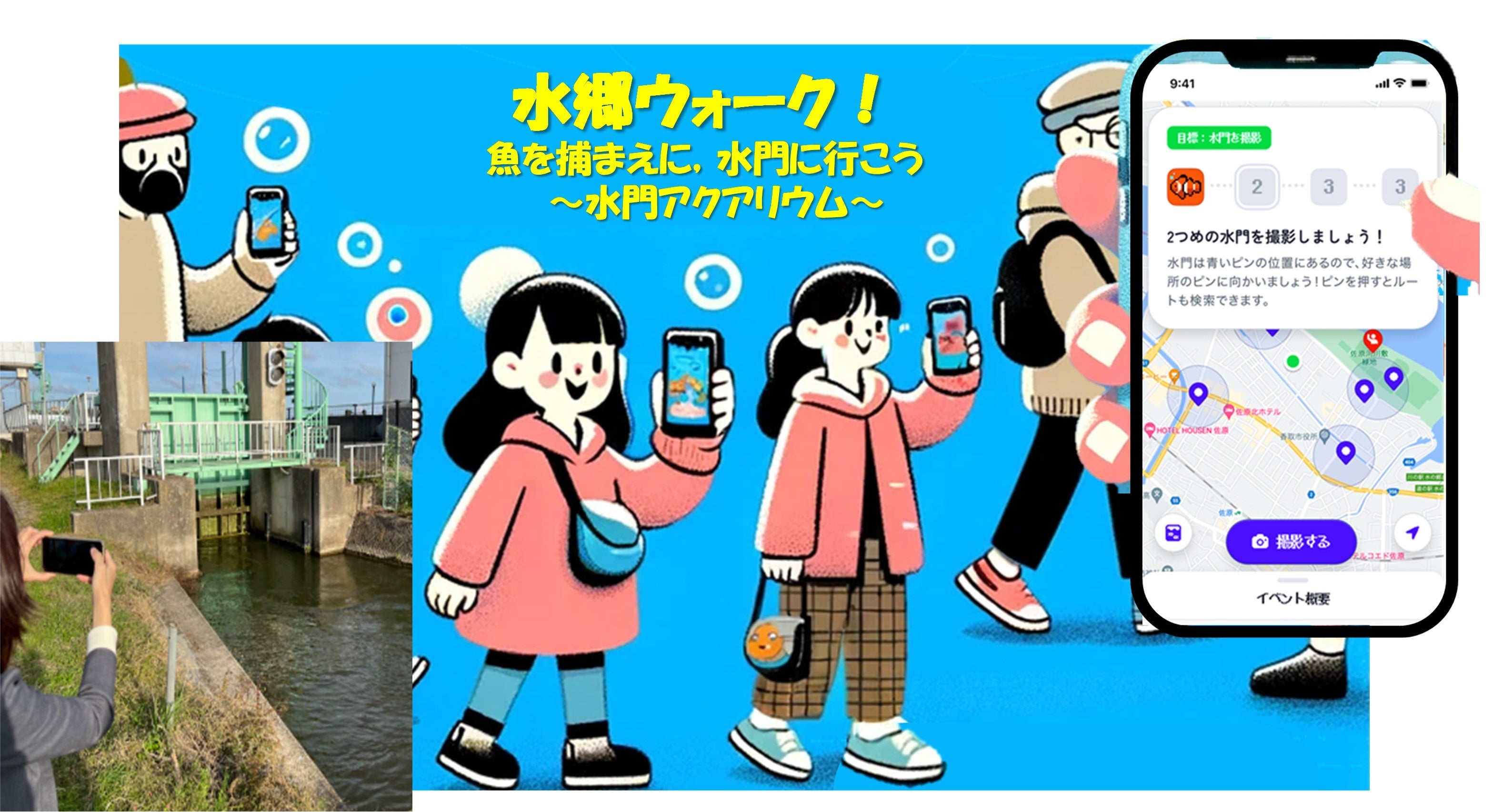本実証は,市民がウォーキングをしながら水門の写真を撮影・投稿し,ウェブ投稿する仕組みをイベント形式で行います。これにより,水門を始めとするインフラ設備への理解を深め,防災意識の向上,地域コミュニティの醸成を図るとともに,インフラ設備の目視点検への活用可能性を検証するもので,水門設備に特化した取り組みとしては,日本初となります。