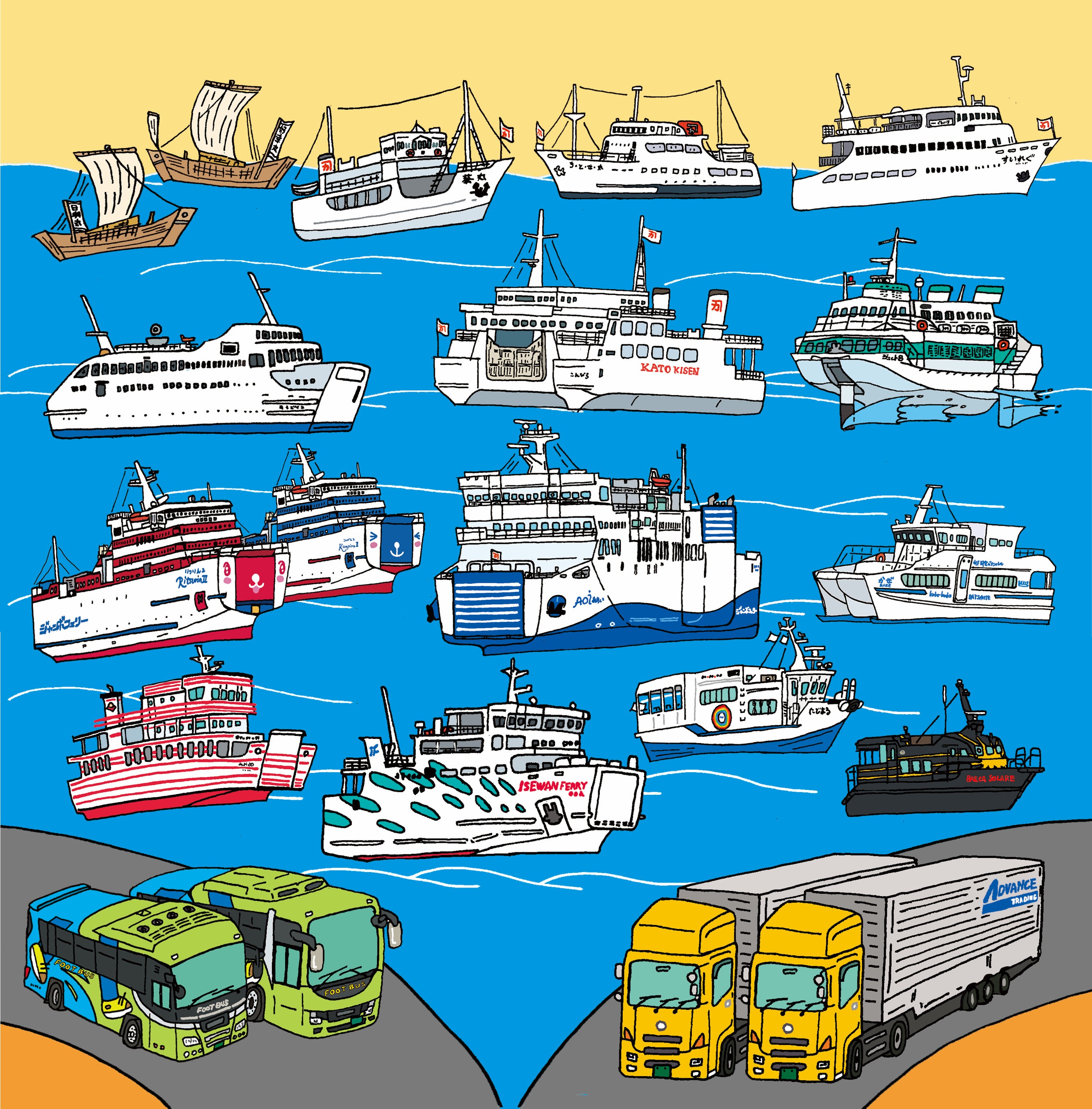 ・加藤汽船グループのりものイラスト入り オリジナル手ぬぐい