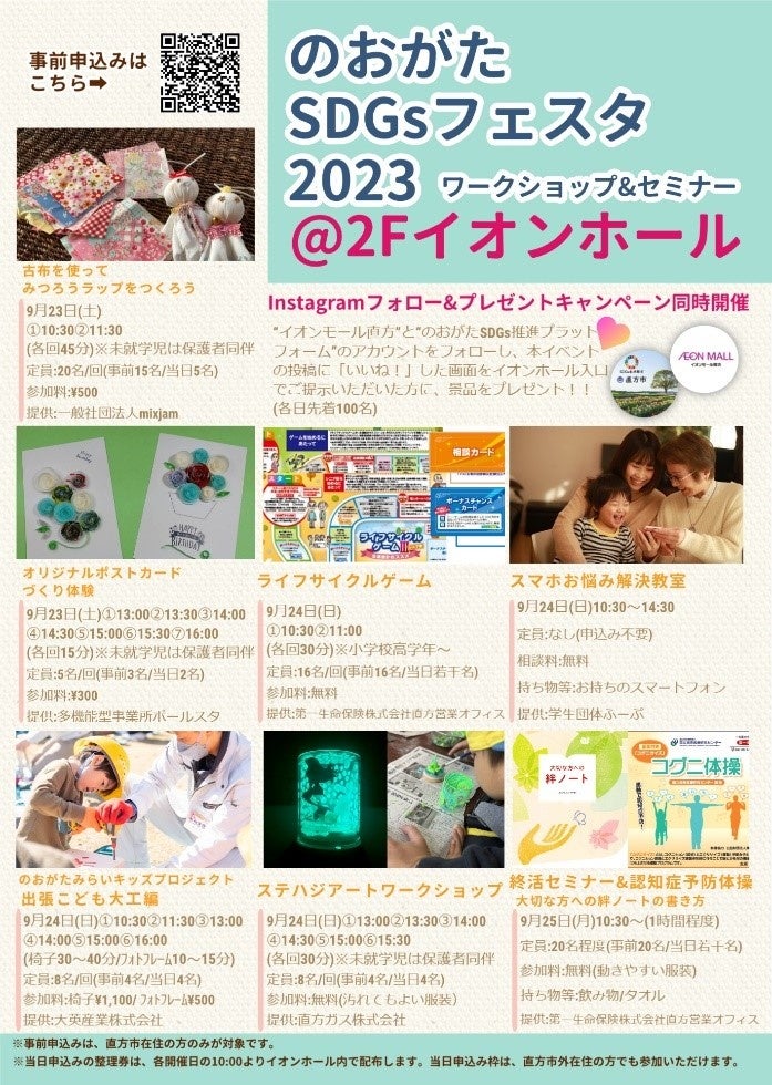 本イベントはイオンモール直方、直方宗像線沿線自治体連絡会議(構成自治体:直方市・鞍手町・宗像市)との共催で、SDGsに向けた取り組みを、ワークショップやセミナー、展示等を通して身近に学べるプログラムのほか、連絡会議による各市町の特産品を集めた物産展も同時開催いたします。