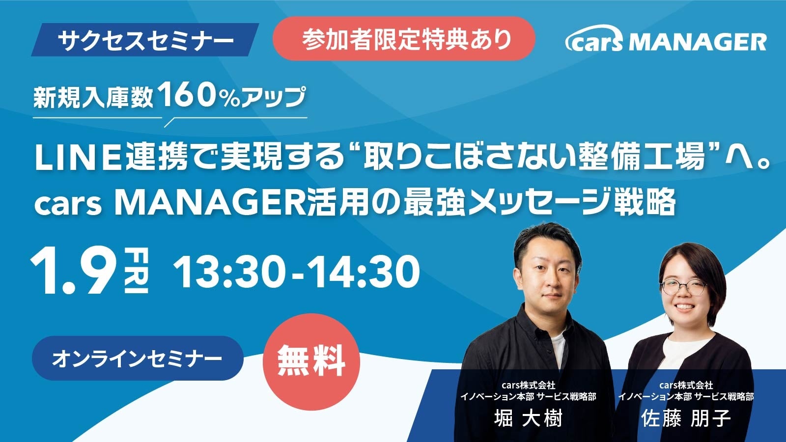 【1月9日開催 cars サクセスセミナー】新規入庫数160%アップ!LINE連携で実現する“取りこぼさない整備工場”へ。cars MANAGER活用の最強メッセージ戦略