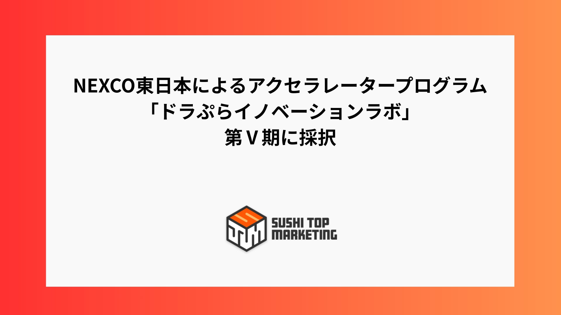 SUSHI TOP MARKETING株式会社(本社:東京都千代田区、代表取締役 CEO:徳永 大輔、以下 「当社」)はは、東日本高速道路株式会社(本社:東京都千代田区、代表取締役社長:由木 文彦、以下 「NEXCO東日本」)が実施するアクセラレータープログラム「ドラぷらイノベーションラボ」にて、応募総数92件の中から第Ⅴ期採択企業の1社として選定されました。