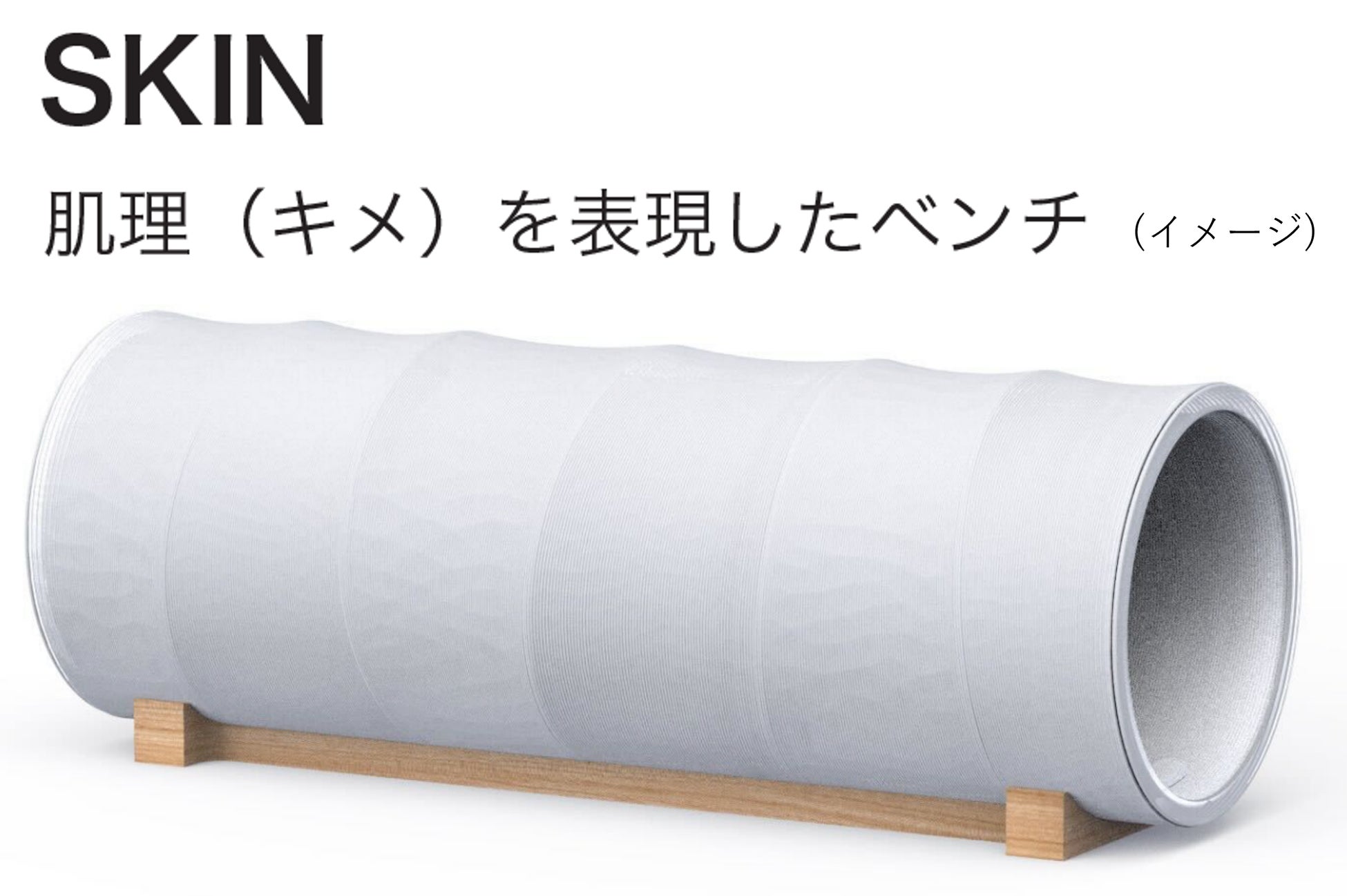 今回製作したベンチデザインは2種類あります。3Dプリンティング成形技術を得意とするVOID株式会社(本社:東京都渋谷区、代表取締役CEO:井上 雅之)(補足資料4)と連携することで、再生プラスチックの配合度合いにより色味がどう変化するかなどの検証を行いながら、視覚的・触覚的な表現も追求しました。デザインの着想は、ポーラ・オルビスグループ独自の化粧品クリームや、研究対象としている”肌”です。心地よい感触の秘密である乳化物の形態や、皮膚表面の肌理(キメ)構造をベンチの表面デザインに模し、「触ってみたい」と感じるベンチを目指し作り上げました(補足資料2)。ベンチに座るだけでなく、手触りを楽しみ、肌についてふと考えるきっかけになれば幸いです。