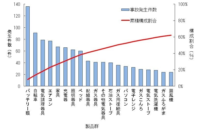 図1は、2022年度に発生した事故の製品群の件数と、累積構成割合を示したパレート図です。全106製品群のうち、件数が上位の20製品群を表示しています。これによると上位20製品群の事故で全体件数の約63%、上位5製品群で約27%を占めています。上位5製品群のうち電気調理器具と家具はリコールにより一時的に多くの事故報告を受けた製品群で、バッテリー類、自転車、エアコンは一昨年度から引き続き多発している製品群です。