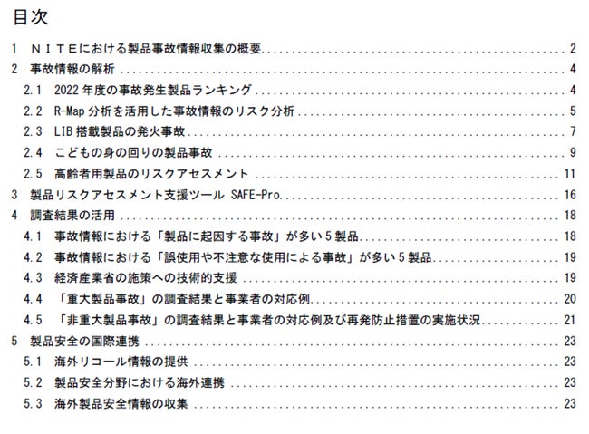 本報告書は、2022年度までに収集した事故情報(2023年8月31日時点)を取りまとめた「事故情報解析報告書」です。近年の製品事故の傾向や調査結果、2022年度にNITEが行った業務等について公表しています。