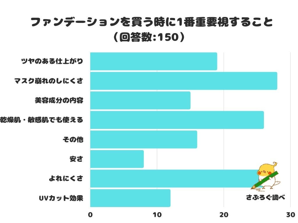 2位以降は、「乾燥肌・敏感肌でも使える」、「よれにくさ」と続き、「安さ」は7位という結果になりました。