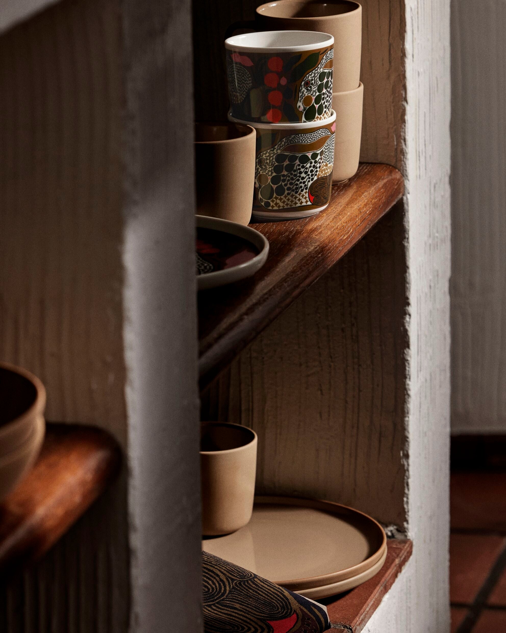 美しい自然のカラーパレットを背景に、森の茂みに身をひそめる大きな茶色い野ウサギ。注意深く回りの様子を伺い、今にも飛び跳ねそう。フォークロアをモダンに解釈したデザイン、ルサッコ(Rusakko/茶色のウサギ)は、デザイナーのアイノ゠マイヤ・メッツォラの新作プリントです。モデルとなった野ウサギは、彼女が実際に森を散策中に保護した、大きな鳥が空から落として傷ついた野ウサギで、このエピソードが着想源となりデザインされました。ブラウンや暖かみのあるレッドなど、秋らしい落ち着いたカラーパレットで描かれています。ファブリックのほか、マグカップやクッションなどのホームコレクション全15アイテムを、全国のマリメッコストア、各オンラインストアにて販売中です。