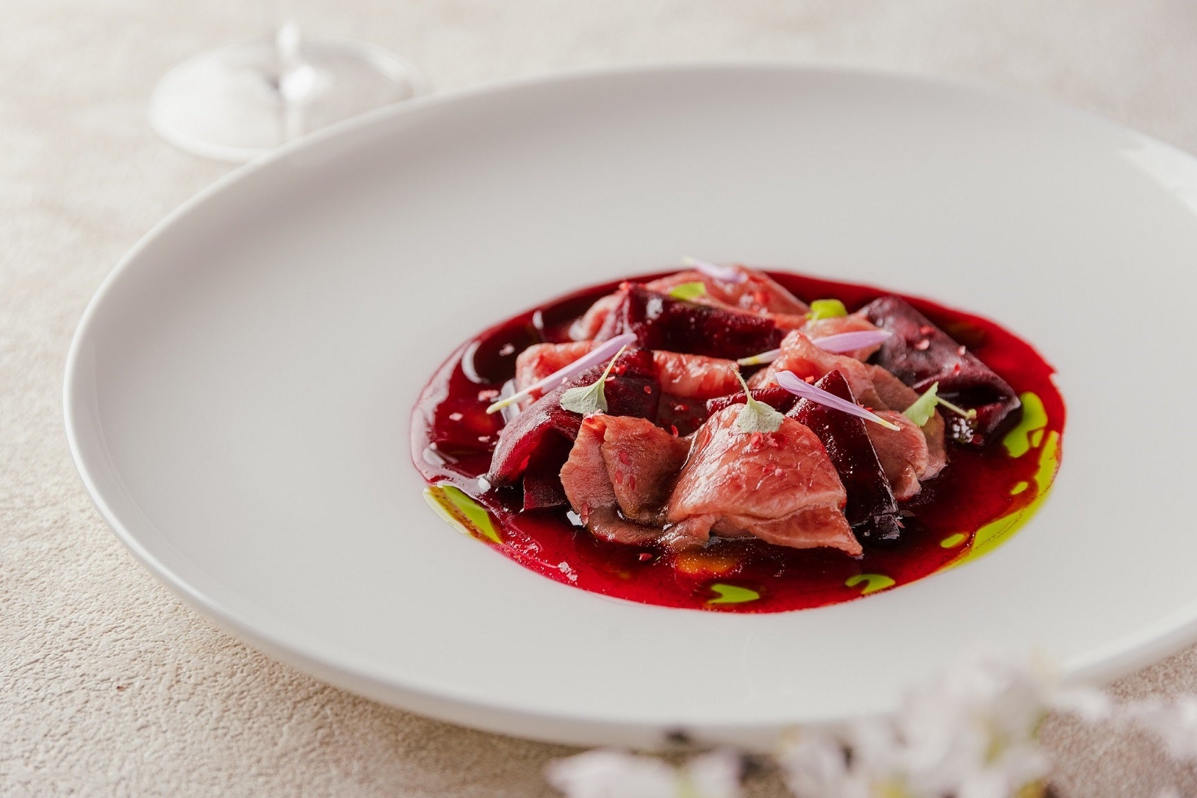 絶妙な火入れの黒毛和牛と鮮やかな赤紫色が印象的なビーツのソースを合わせました。やわらかな肉質の黒毛和牛の旨味とビーツの甘み、香りをお楽しみいただる一品です。アクセントにピンクペッパー、彩りにグリーンのハーブオイルを加えました。肉汁たっぷりの黒毛和牛とソースの相性をぜひお試しください。