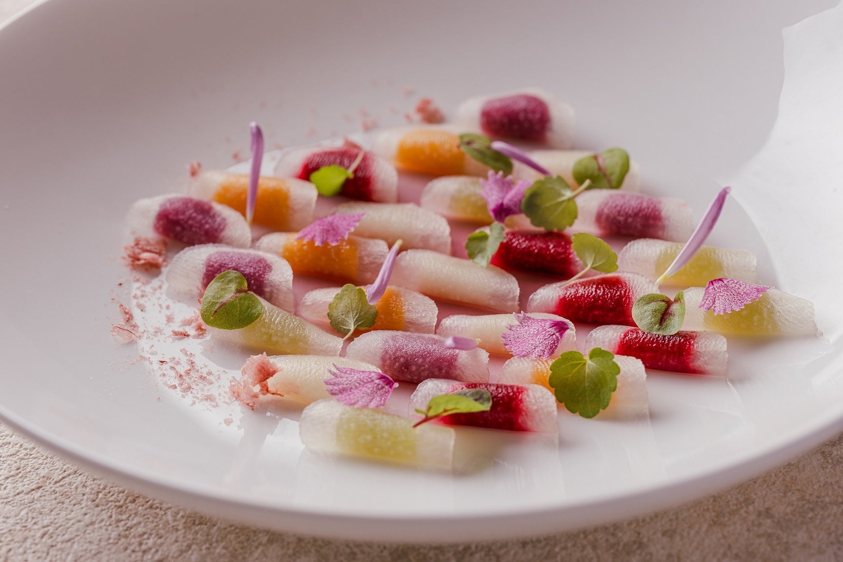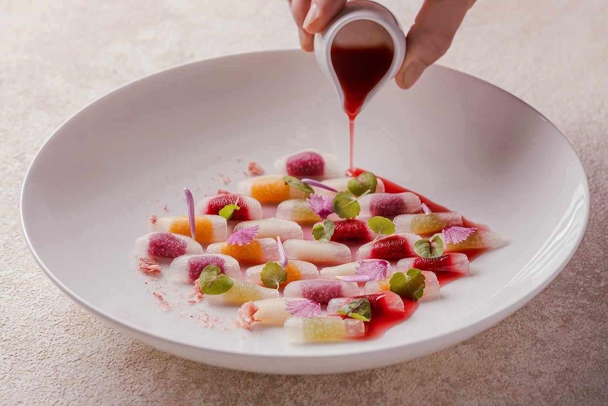 ピューレにした紫芋、ビーツ、バターナッツかぼちゃ、菊芋、デトックスジュレ(きゅうり、セロリ、りんごにシャンパーニュを合わせたジュレ)をマリネした大根で包み、お皿をパレットに見立て美しく並べました。やさしい味わいの野菜にシャンパーニュを合わせ、ビーツの朱色を生かした野菜のソースでお召し上がりいただきます。
