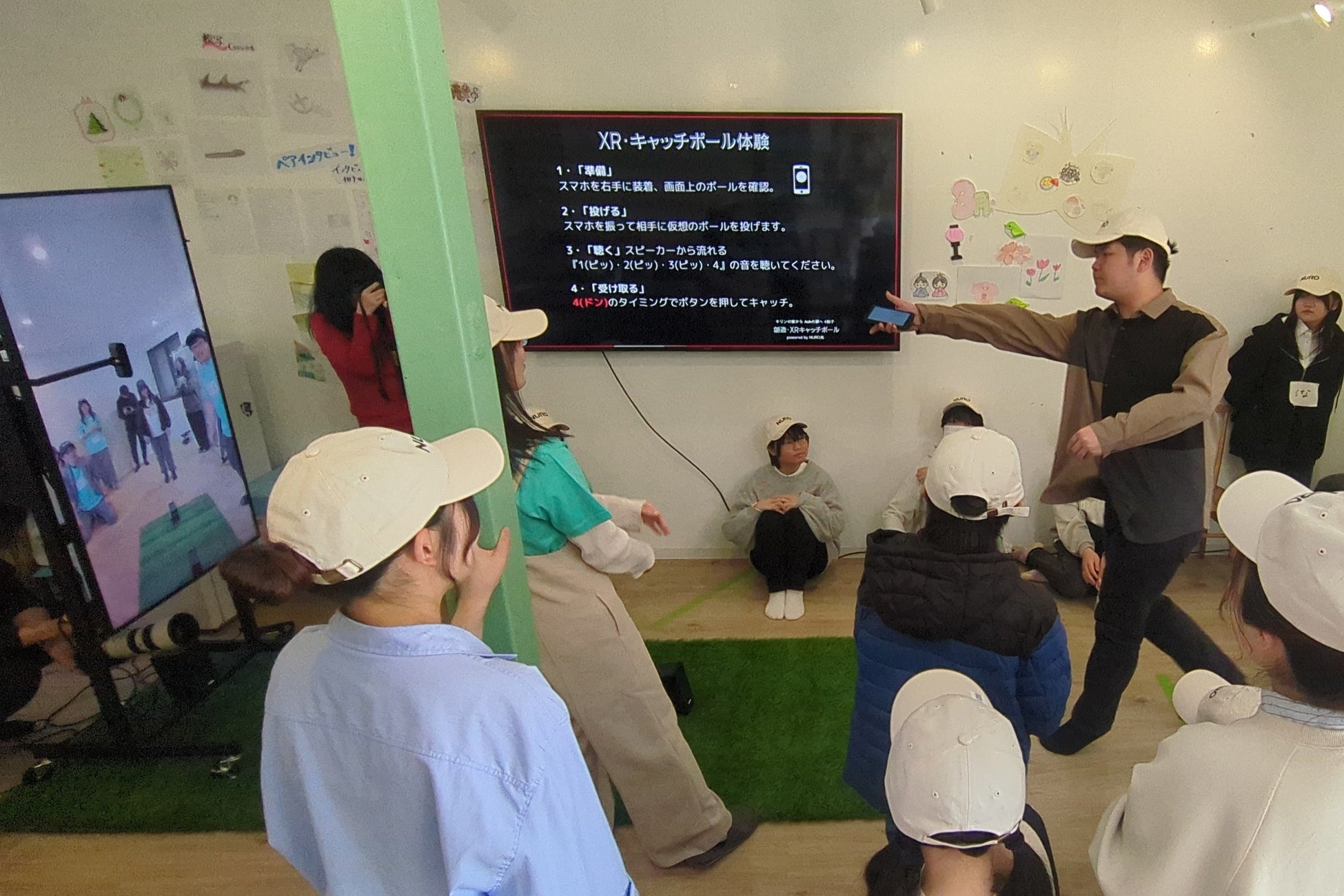 バーチャル上で仮想のボールやりとりする「XRキャッチボール」(※2)を用いて、約600㎞の距離が離れた福岡-大阪間で、子どもたちが思い思いにキャッチボールを楽しみました。