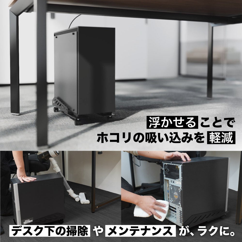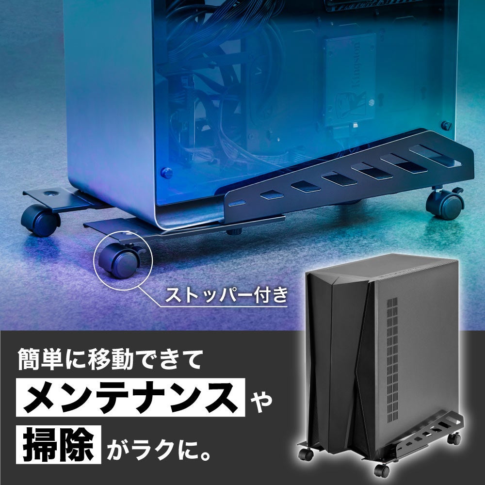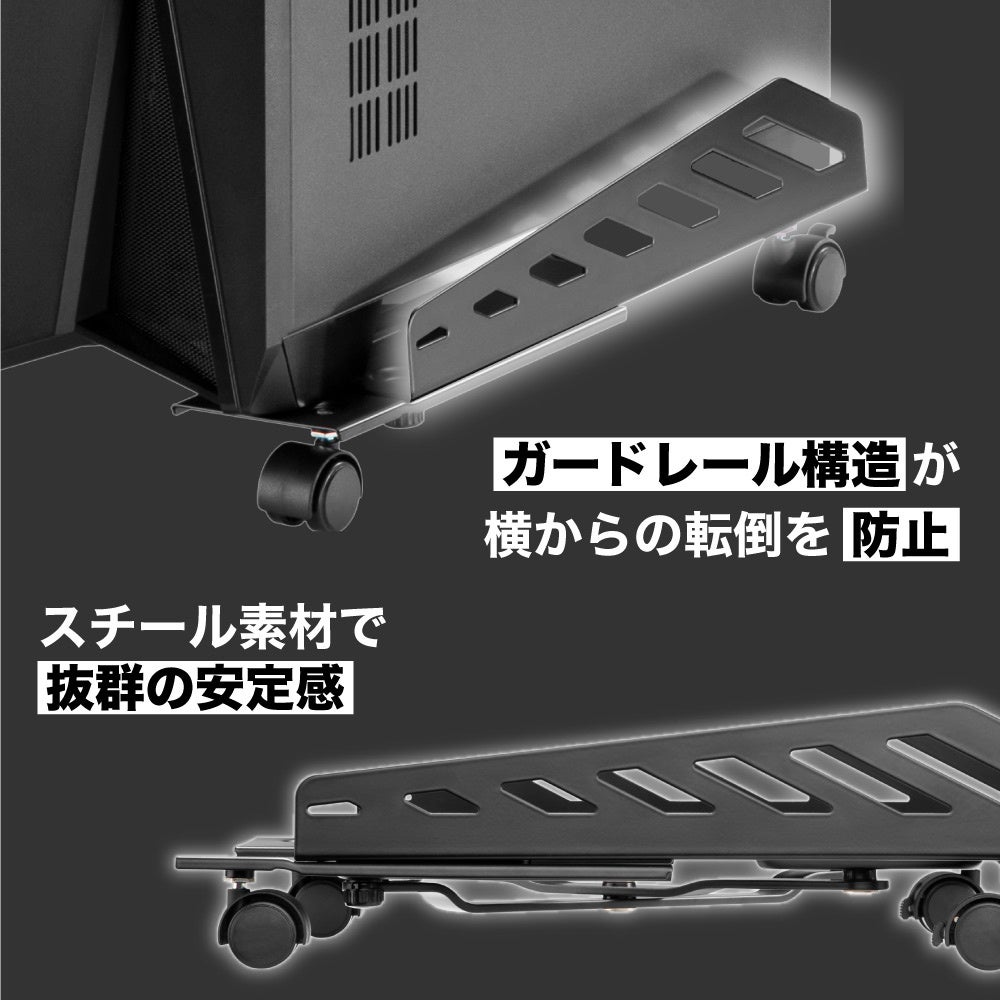 本製品はパソコンの大きさに合わせてサイズを変えられるキャスター付きのパソコン用スタンド(CPUスタンド)です。