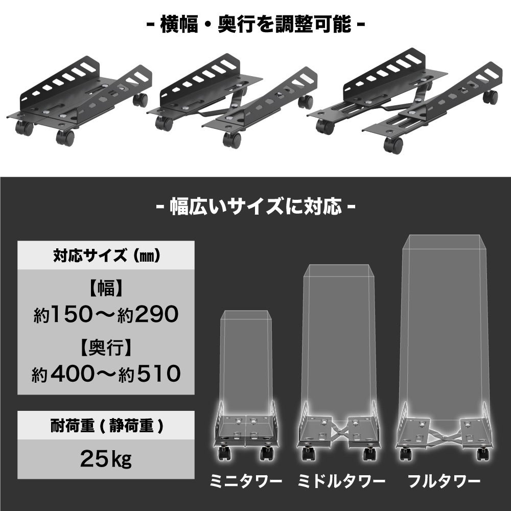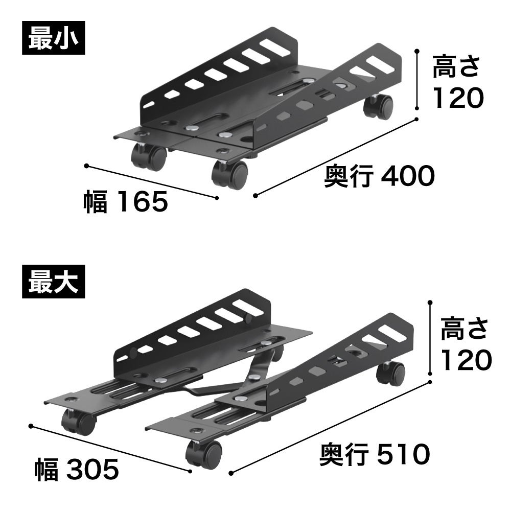 サイズは幅16.5~30.5cm奥行40~51cm高さ12cm。重量2kg。耐荷重25kg。スチール素材を採用。底面のダイヤルを緩めることで左右奥行の大きさを変えることが可能。小型のパソコン(ミニタワー)から中型(ミドルタワー)、大型(フルタワー)のパソコンまで対応可能。左右のガード付きで落下を防ぎます。キャスター付きで自由に移動が可能。前2か所のキャスターはロック付きで不用意に動くのを防ぎます。
