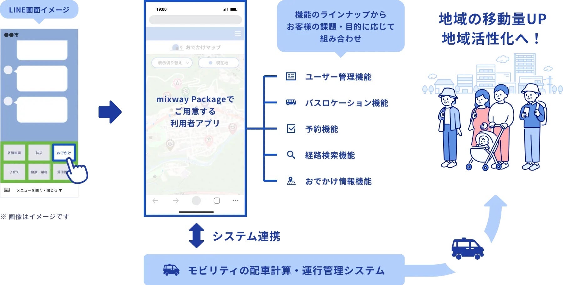 「mixway Package」は、LINE公式アカウントを窓口に、地域のおでかけ情報、二次交通を含めた交通の検索・予約、決済、デジタルチケット、クーポン等のさまざまな機能を組み合わせ、交通を軸としたまちづくり施策に活用できるモビリティ統合アプリを開発する自治体向けサービスです。アプリをイチから開発するのではなく、既存のラインナップから必要な機能を組み合わせることで、開発期間と労力を大幅に削減し、低コストでご利用を開始いただけます。また、LINEをベースにサービスを展開することで、効率的な集客や利便性の高いサービスの提供を実現します。