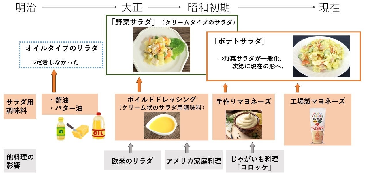次第に、野菜サラダが一般化し日本で広まっていく中で、じゃがいも料理として浸透していた「コロッケ」等の他料理の影響を受けて、現在の潰したじゃがいもが用いられるポテトサラダへと変化。現在のような、マヨネーズで和えて具材が豊富なポテトサラダへ進化・普及していったのは、工場製マヨネーズの生産量が増える、1955年頃以降だということが分かりました。(図:ポテトサラダの変遷)