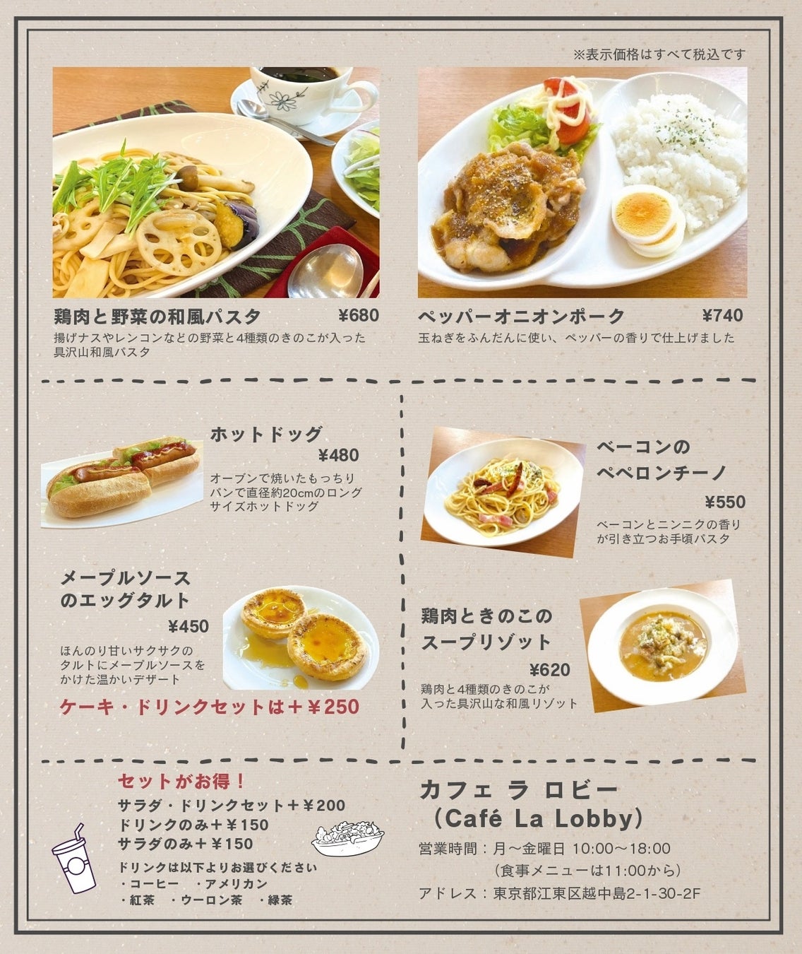 東日印刷株式会社〈TONICHI〉の本社(江東区越中島2-1-30)2階にある喫茶レストラン「カフェ ラ ロビー」は4月16日より新メニューを追加します。地域の皆さまを始めとする幅広いお客様にご来店いただけるよう、パスタやリゾット、ワンプレートメニューなどのラインナップをさらに充実させました。また、今回新たに忙しい時間の合間に手軽に召し上がれるホットドッグなどの軽食やデザート、ドリンクも加わり、午後のティータイムも楽しめる憩いの場を提供いたします。皆様のお越しを心よりお待ちしております。