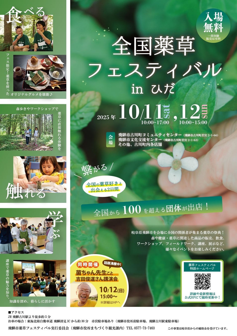 飛騨市では、10月11日・12日の2日間「全国薬草フェスティバル in ひだ」を開催。「健康生活」をテーマに全国から集結する100団体が勢揃い!薬草を活用したグルメやワークショップが楽しめます。