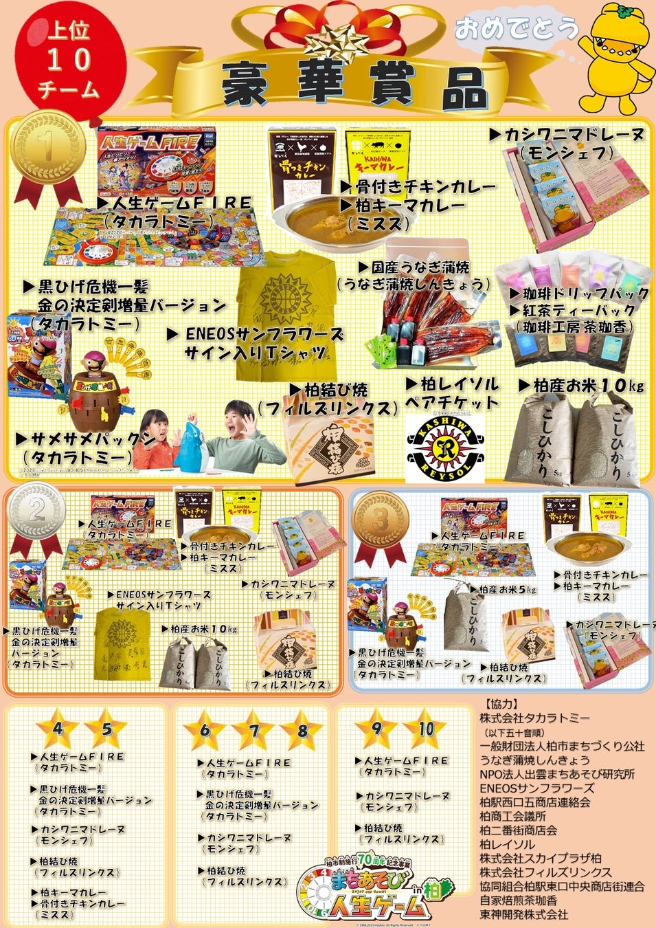 各日500チームの中から、ゴール時の所持金(専用紙幣)が多かった上位10チームには、株式会社タカラトミーの提供によるおもちゃや柏市ふるさと産品などの豪華賞品をプレゼント!!