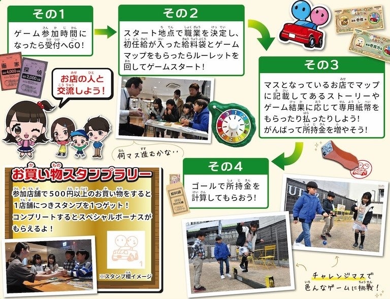 このイベントは、商店街を舞台とした体験型のリアル「人生ゲーム」です。